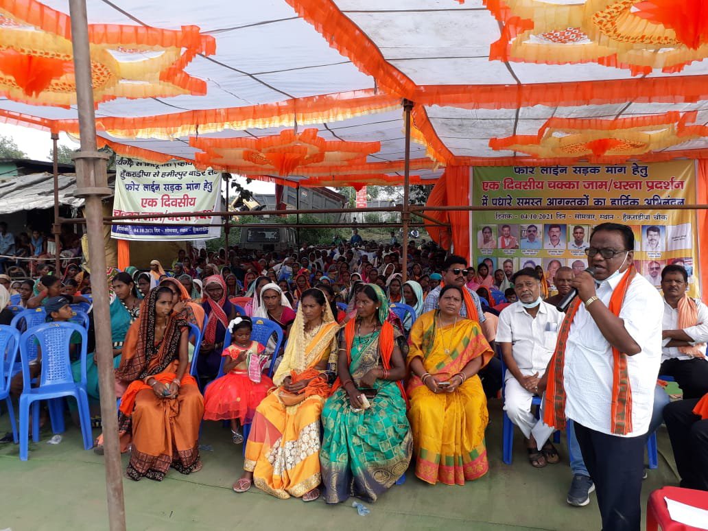 तमनार ब्लाक में सड़क पर बढ़ते प्रदूषण इतने ज्यादा हो गए हैं कि लोग दोपहिया वाहन से आवागमन करने पर जीवन दूभर हो रही है।खस्ता हाल व जर्जर सड़क के साथ फ़ोर लाइन सड़क की मांग को लेकर तमनार जनपद के जनपद पंचायत सदस्य के नेतृत्व में भाजपा व सैकड़ो ग्रामीणजन चक्काजाम कर धरना प्रदर्शन किया गया। मिलुपारा से रायगढ़ तक का सड़क विकास खण्ड तमनार क्षेत्र में गई उद्योग एवं कोयला खदान होने के कारण कई वर्षों से सड़क पूर्णतः जर्जर हो चुका है इस कारण आये दिन हमेशा दुर्घटना होते रहता है साथ ही क्षेत्र में वाहन ओवर लोडिंग के कारण धुल एवं डस्ट कीचड़ से क्षेत्रवासी कई प्रकार के बीमारी से ग्रसित हो रहे है। पूर्व मंत्री सत्यानंद राठिया ने कहा कि सड़क की जो दुर्दशा बनी हुई है उससे समझ यह नहीं आता है कि सड़कों में गढ्ढो है या सड़क सड़क में गड्ढे, रायगढ़ जाने में 1 घंटे के बजाय अब ढाई घंटे लगने लगे हैं। जनपद सदस्य के नेतृत्व में भाजपा व हजारो ग्रामीणों द्वारा फोर लाइन सड़क की मांग को लेकर आज आंदोलन कर रहे, साथ ही प्रदूषण का स्तर भी बढ़ते जा रहे हैं, जब से कांग्रेस की सरकार आई है तब से सड़के जर्जर होने लगी है सरकार सड़क पर ध्यान ही नहीं दे रही है। उद्योंगो से मिलने वाले सी.एस.आर. राशि की मद से तराईमाल से मिलुपारा से हुंकराडीपा से हमीरपुर बॉर्डर तक फ़ोर लाइन सड़क निर्माण की मांग रखी गई।आज तो केवल एक दिवसीय चक्का जाम था आने वाले दिनों में अनिश्चितकालीन 6 जतिन साव व रोडोंपाली मंडल अध्यक्ष बंशीधर चौधरी ने कहाकि यह सरकार केवल कका और बबा में भूल गई है, छत्तीसगढ़ विकास से कोसो दुर होते जा रहा है, छत्तीसगढ़ में जितने भी सड़क बनी है वह भाजपा के शासन में बनी लेकिन उन सड़कों का जतन भी वर्तमान की सरकार नहीं कर पा रही है।भाजपा युवा मोर्चा के जिला अध्यक्ष विनायक पटनायक ने कहा कि भूपेश बघेल ने इतिहास रच दिया है, किसी सड़क की टेंडर होने की पूर्व भूमि पूजन करना इतिहास है… आज तक सड़कों की टेंडर हो जाने के पश्चात ही भूमि पूजन होती थी लेकिन अब पता नहीं पूजन तो हो गई है लेकिन सड़क कब बन पाएगी ।