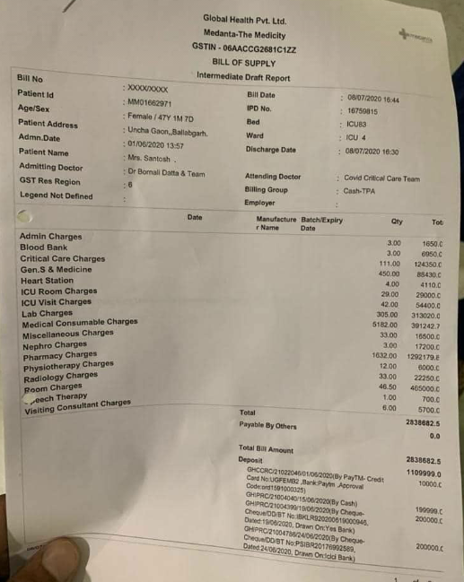 हरियाणा // गुरुग्राम के मेदांता अस्पताल के एक कोरोना मरीज के इलाज का 28 लाख का बिल का मामला सामने आया है। आपको बता दे की सरकार ने कोविड-19 इलाज के लिए रेट तय किए हैं। लेकिन कुछ निजी अस्पताल ने मरीज की बीमारी का फायदा उठाकर मोटी रकम वसूलते हैं। और इस कोरोना महामारी को भी पैसा कमाने का जरिया बना लिया है। कुछ लोग इस पेशे से जुड़े सफेद कपड़ों के पीछे काली कमाई के इरादे पाले बैठे रहते हैं। ..