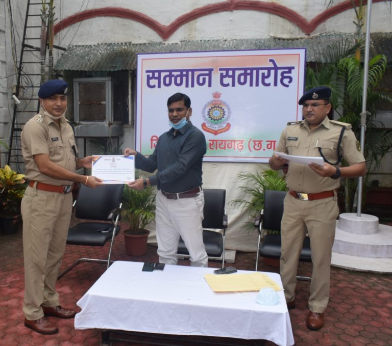 रायगढ़ पुलिस का सम्मान समारोह : ATM लूटपाट के आरोपियों को पकड़ने चलाये गए ऑपरेशन में पुलिस के सहयोगी रहे ग्रामीणों एवं सिक्युरिटी गार्ड का सम्मान ….