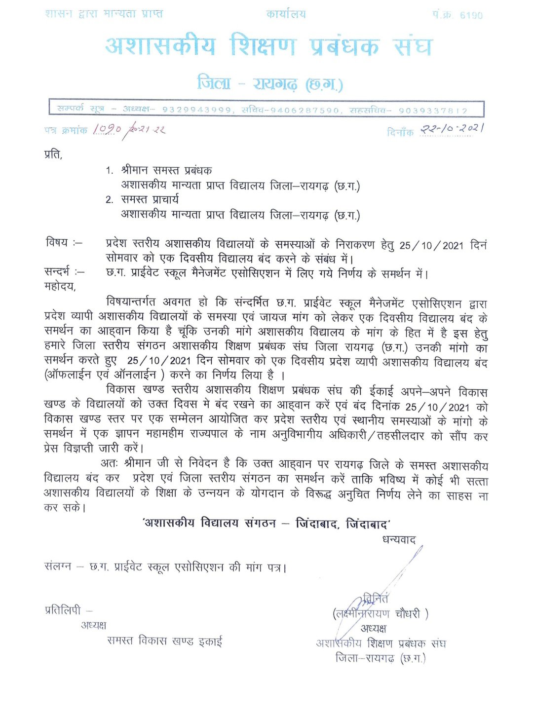 छ ग में अशासकीय विद्यालय 25 अक्टुबर को रहेगी बन्द 🔹 अशासकीय शिक्षण प्रबंधक संघ जिला रायगढ़ द्वारा छ.ग. प्राईवेट स्कूल मैनेजमेंट एसोसिएशन के समर्थन में रखेगी बन्द – एल एन चौधरी