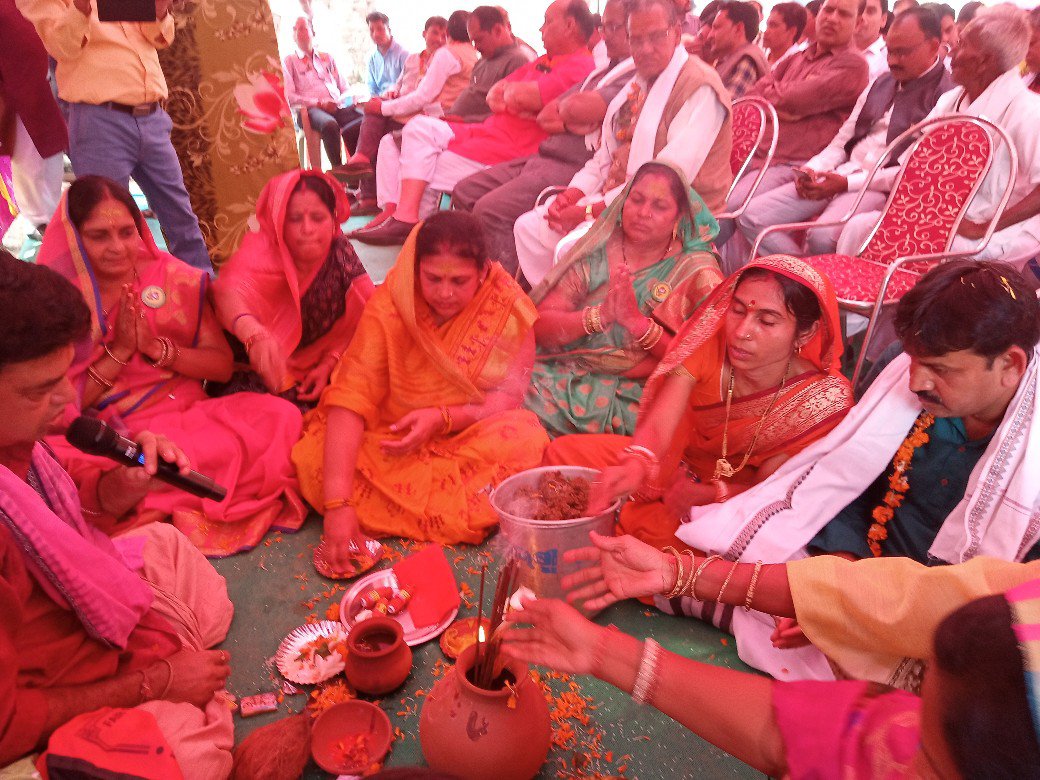 सर्वप्रथम ग्राम लैडा के माँ समलाई मंदिर में पूजा अर्चना के बाद शोभायात्रा निकाली गई जिसमें गांव के समाजिक बन्धुओ माता बहनों ने आरती तिलक रोली लगाकर पुष्प वर्षा के साथ भव्य स्वागत किया गया कार्यक्रम स्थल पर विधि विधान के साथ माटी पूजन की गई।