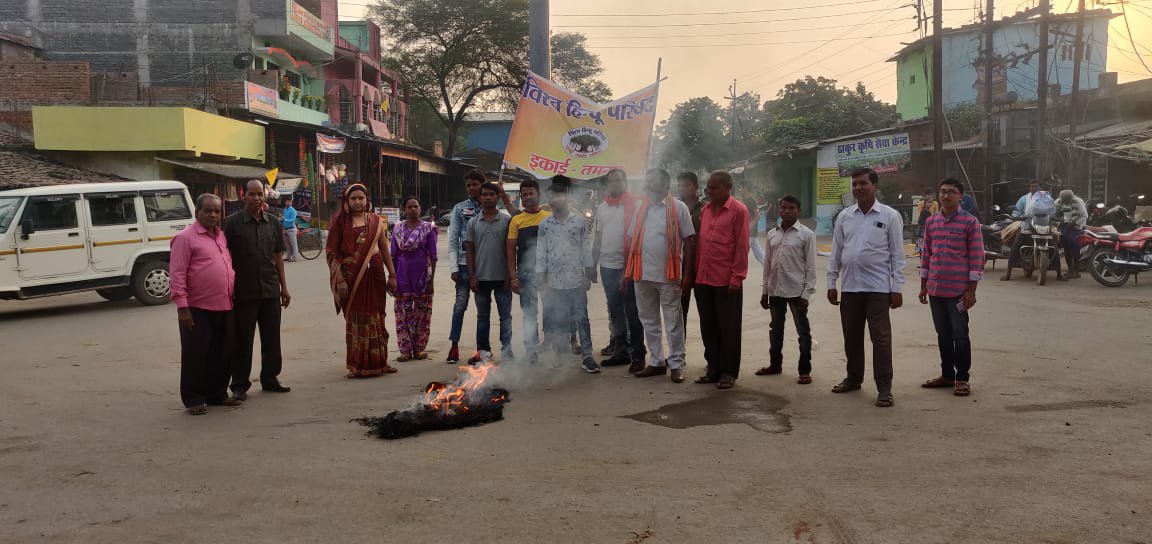 तमनार @ संदेशा 24 भारतीय जनता पार्टी के प्रदेश आव्हान पर भारतीय जनता पार्टी तमनार के समस्त कार्यकर्ता पूरे छत्तीसगढ़ राज्य में कांग्रेस सरकार के विरोध में पुतला दहन कार्यक्रम को मूलरूप दे रही है।इसी तारतम्य में तमनार मण्डल व युवा मोर्चा ने कवर्धा में हिन्दू विरोधी लोगों द्वारा भगवा ध्वज को लेकर दंगाइयों द्वारा मारपीट किया गया है।इन दंगाइयों को कांग्रेसी नेता मोहम्मद अकबर मंत्री का संरक्षण प्राप्त है।दंगाइयों के खिलाफ FIR तक नहीं होने दिया जा रहा है।
