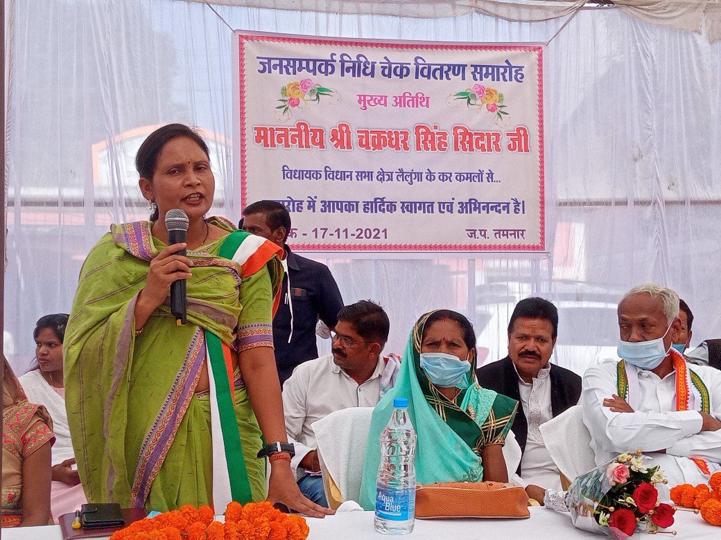 मुख्य अतिथि लैलूंगा विधायक चक्रधर सिंह सिदार ने कहा कि छत्तीसगढ़ में भुपेश बघेल कांग्रेस सरकार द्वारा राजीव गांघी न्याय योजना,वन अधिकार पट्टा,हरियाली योजना,वनोपज संग्रहण, नरवा गरवा घुरवा बारी अन्य जनकल्याणकारी योजनाओ का ग्रामीणजन शत प्रतिशत लाभ उठावें।गांव के अंतिम व्यक्ति तक शासन की विभिन्न योजना पहुंचे इसके लिए सभी सरपंच,बीडीसी व जनप्रतिनिधि,विभाग के कर्मचारी समर्पित होकर अपने कर्तव्यों का निर्वहन करें।कांग्रेस सरकार द्वारा धान बोनस एवं 25 सौ रुपये क्विंटल धान लेने,बिजली बिल हाफ अन्य वायदा पूरा किया गया। महिला समूहों की कर्ज भी माफ की जाएगी। गांवो के जरूरतमंद लोग को अपनी आर्थिक स्थिति सुदृढ करने हेतु विधायक जनसंपर्क राशि जनपद तमनार के 67 लोगो को 2 लाख 80 हजार रुपये का चेक प्रदाय किया गया है।गांव के अन्य जरूरतमंद लोगों को आगामी वर्ष राशि प्रदान की जाएगी।मुुख्यमंत्री भूपेश बघेल का आभार व्यक्त करते कहाकि छत्तीसगढ़ की गांव गरीब किसान मजदूर युवा महिलाओं के साथ सभी वर्गों का सर्वांगीण विकास हेतु हरसम्भव प्रयास किया जा रहा है।