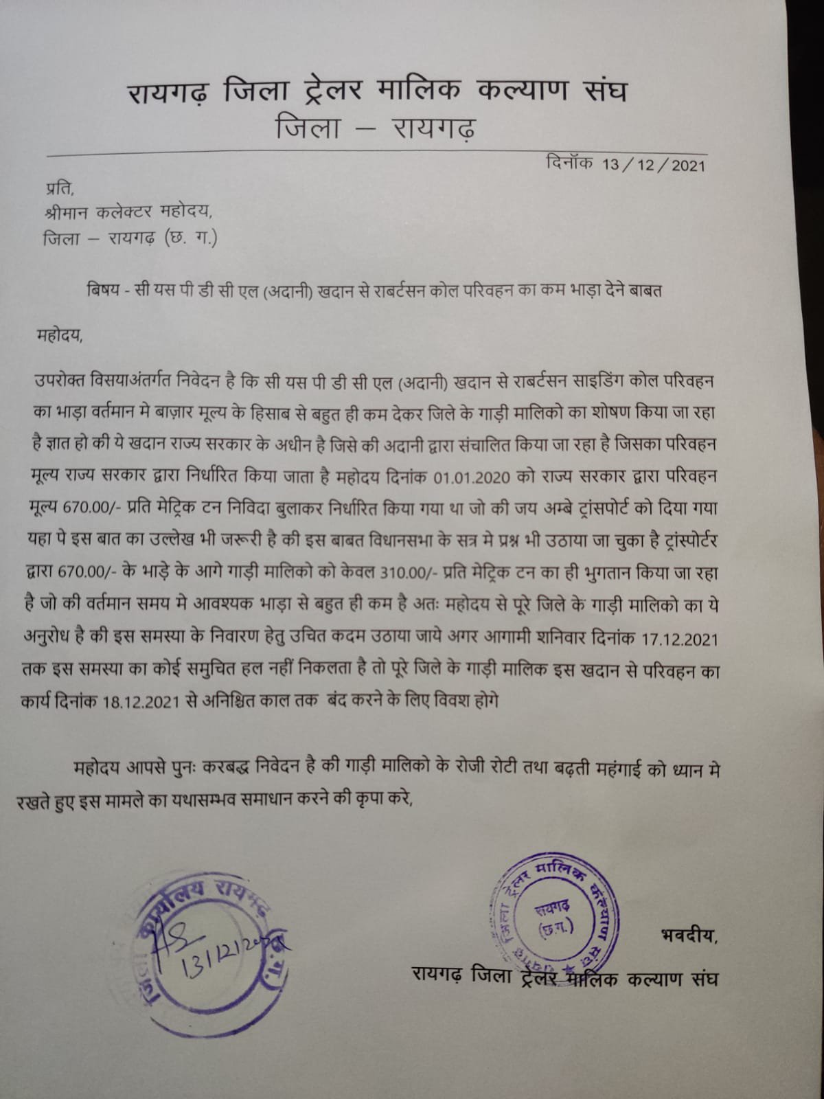 तमनार @ संदेशा 24 अदानी कोल माइंस से रॉबर्टसन साइडिंग के कम भाड़े को लेकर जिला ट्रेलर मालिक कल्याण संघ ने मोर्चा खोल दिया है। उन्होंने आज जारी विज्ञप्ति में बताया कि हमने 14 दिसंबर को जिला प्रशासन को ज्ञापन दिया था जिसमें कि हमने 17 दिसंबर तक का समय तय किया था की हमे हमारे हक का उचित भाड़ा मिलना चाहिए। पर इस समय अवधि के बीच में प्रशासन एवं ट्रांसपोर्टर द्वारा कोई भी बातचीत की पहल नहीं की गई इसलिए मजबूरी वश पूरे यूनियन ने अपने ज्ञापन में तय समय के अनुसार अपने वाहनों से अदानी माइन्स का कोयला परिवहन बंद कर दिया है।