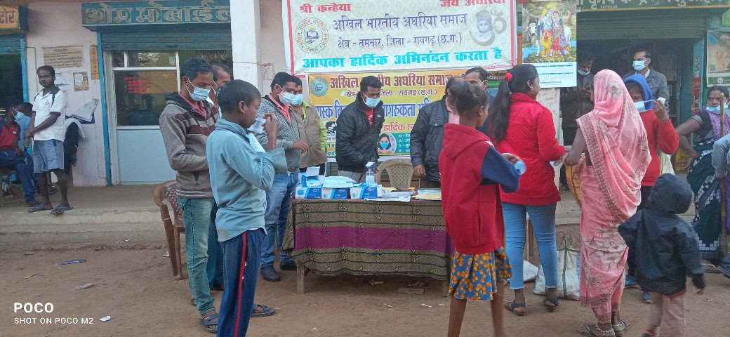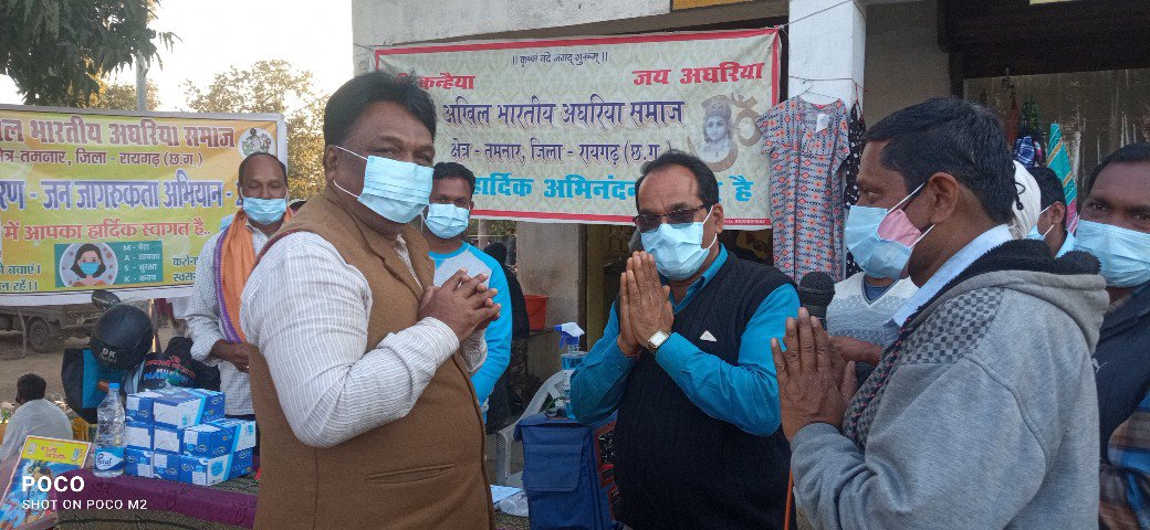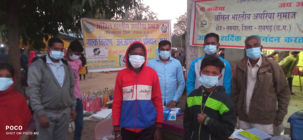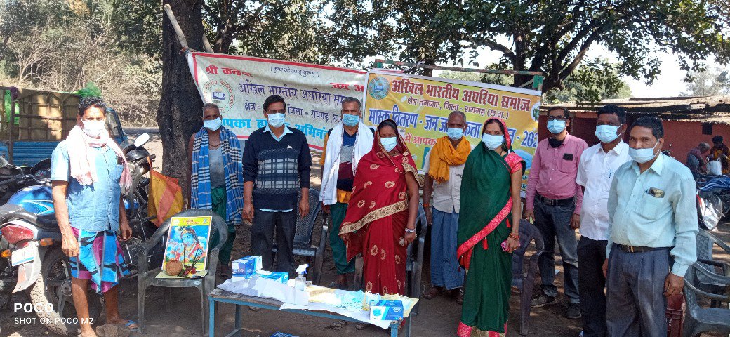 तमनार /दुलेन्द्र पटेल 2.2.2022 अखिल भारतीय अधरिया समाज क्षेत्र तमनार द्वारा कोरोना संकट काल तीसरी लहर को देखते हुए बिना मास्क वाले जरूरतमंदों को दिनांक 27 जनवरी से निःशुल्क मास्क वितरण के साथ कोरोना बचाव जनजागरूकता अभियान के तहत 31 जनवरी को झिंकाबहाल,उरबा एवं 1 फरवरी को पालीघाट,खम्हरिया में हजारो ग्रामीणजनों को स्टाल लगाकर निःशुल्क मास्क वितरण के साथ कोरोना बचाव जनजागरूकता पम्पलेट बांटा गया।