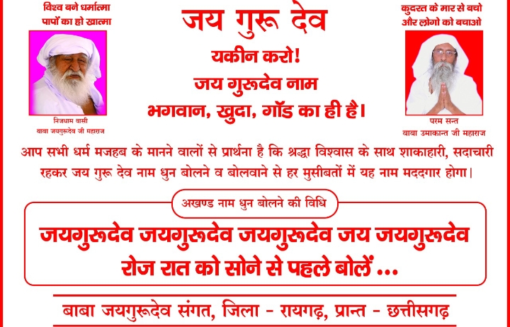आप भी आजमाईश करके देख सकते हैं।इस शुभ अवसर पर बाबा जयगुरु देव संगत रायगढ़ ने समस्त जिलेवासियों को आग्रह किया है कि इस अवसर का लाभ उठायें, समय से सतसंग सुने और परिवार सहित मित्रों को सुनवाएं।