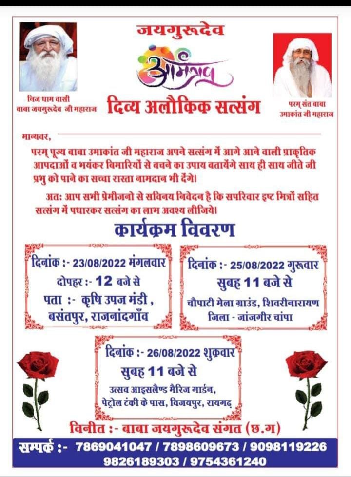 दुनिया में सहारा अगर है तो वह संतों का दरबार है और आप लोगों को जानकर खुशी होगी कि ऐसा ही एक दरबार जय गुरु देव बाबा उमाकांत जी महाराज जी का उत्सव आईलैंड विजयपुर रायगढ़ में लगने जा रहा है। इस सतसंग दरबार में बाबा जय गुरुदेव जी महाराज के आध्यात्मिक उत्तराधिकारी बाबा उमाकांत जी महाराज जी उज्जैन से अपने हुजूम के साथ पधार रहे हैं, जिसमें वे सभी जाति धर्म के मानने वालों को नि:शुल्क आध्यात्मिक ज्ञान देंगे।