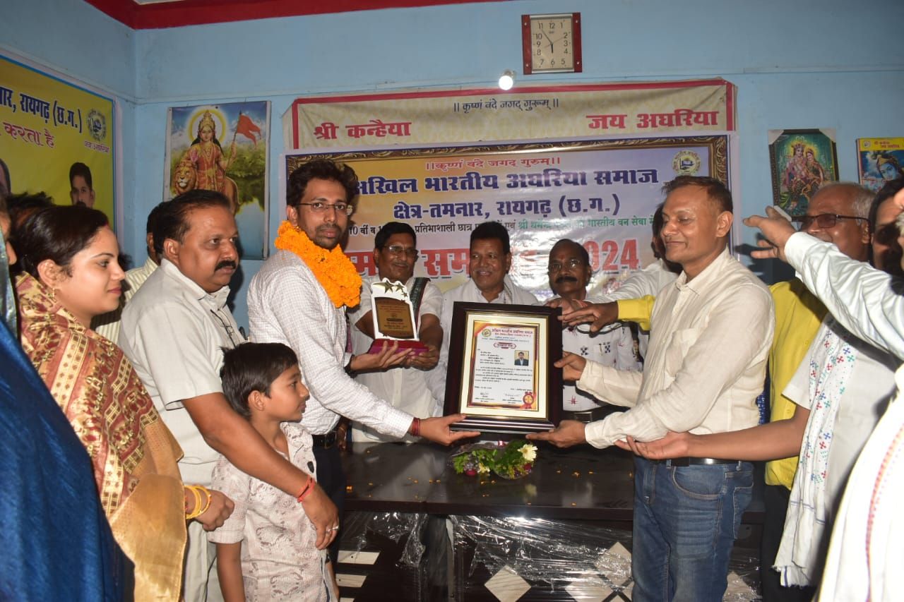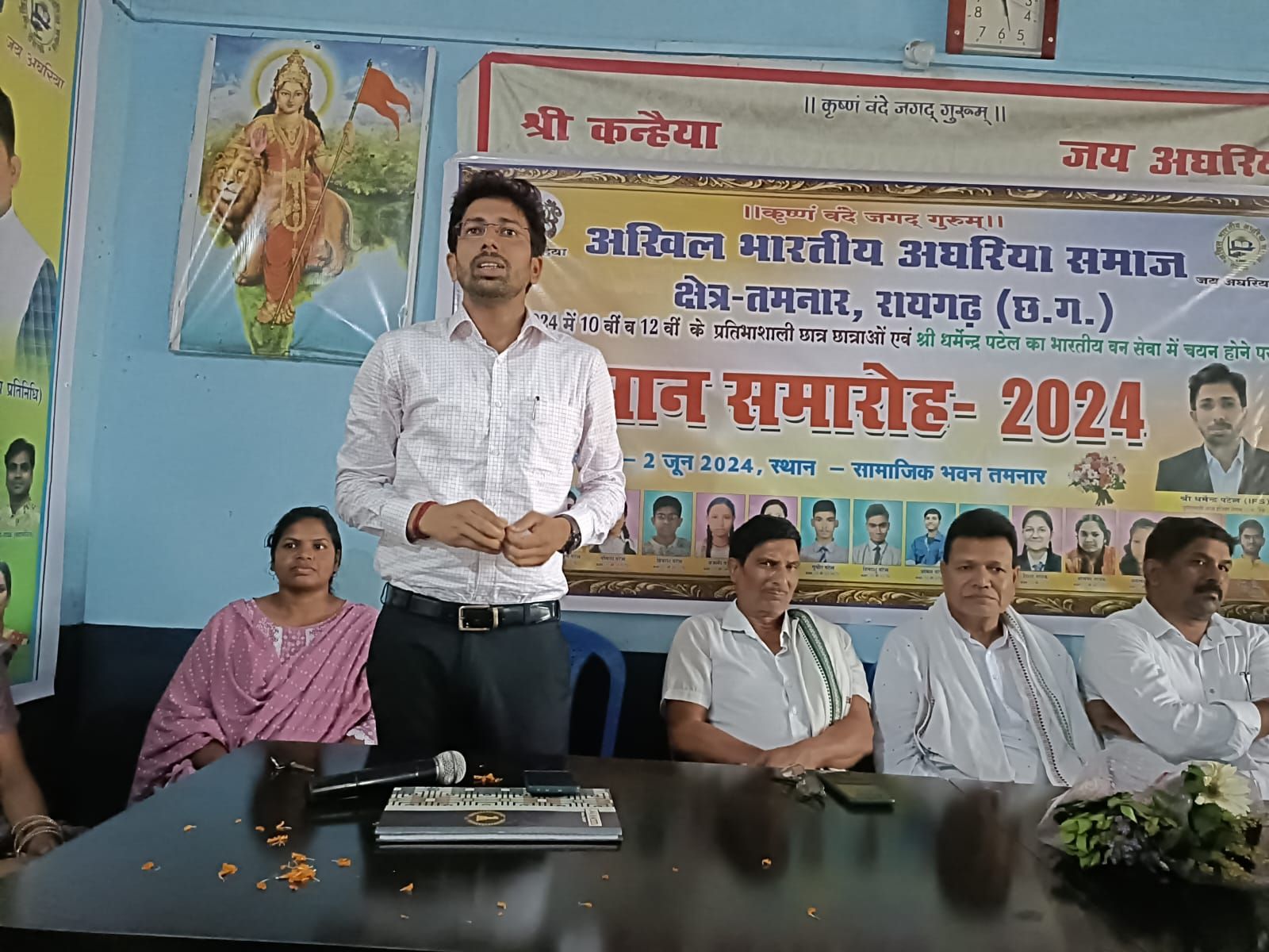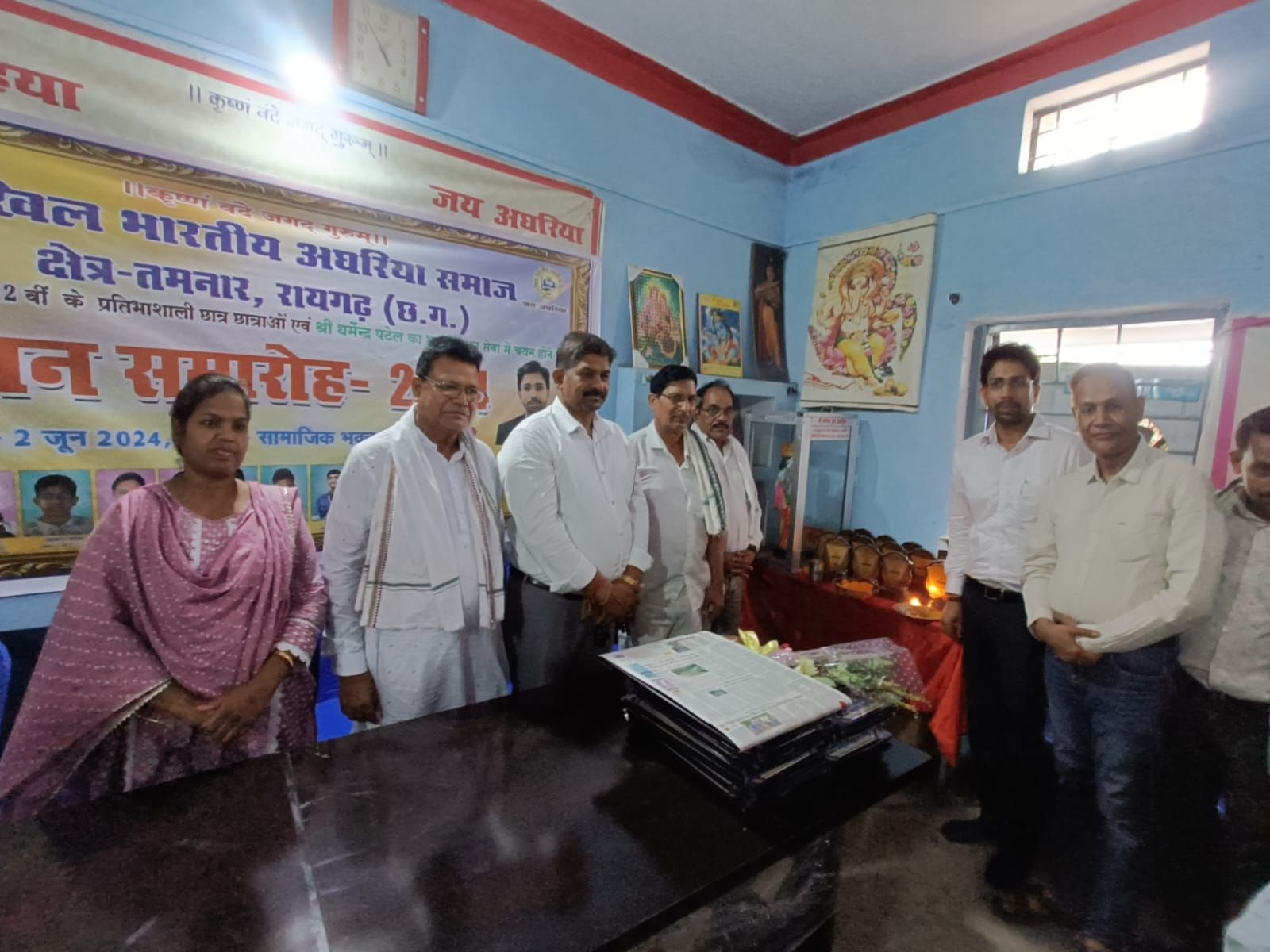 अखिल भारतीय अघरिया समाज क्षेत्र तमनार द्वारा 2जून रविवार को अघरिया सदन सामाजिक भवन तमनार में यादलाल नायक जी की अध्यक्षता में भारतीय वन सेवा के लिए चयन ऑल इंडिया लेवल 92 वां रैंक धर्मेन्द्र पटेल जी की मुख्य आतिथ्य में वर्ष 2024 में 10 वीं व 12 वीं के 90 प्रतिशत से अधिक अंक वाले प्रतिभाशाली छात्र छात्राओं को अभिनन्दन पत्र स्मृति चिन्ह भेंटकर सम्मानित किया गया।
