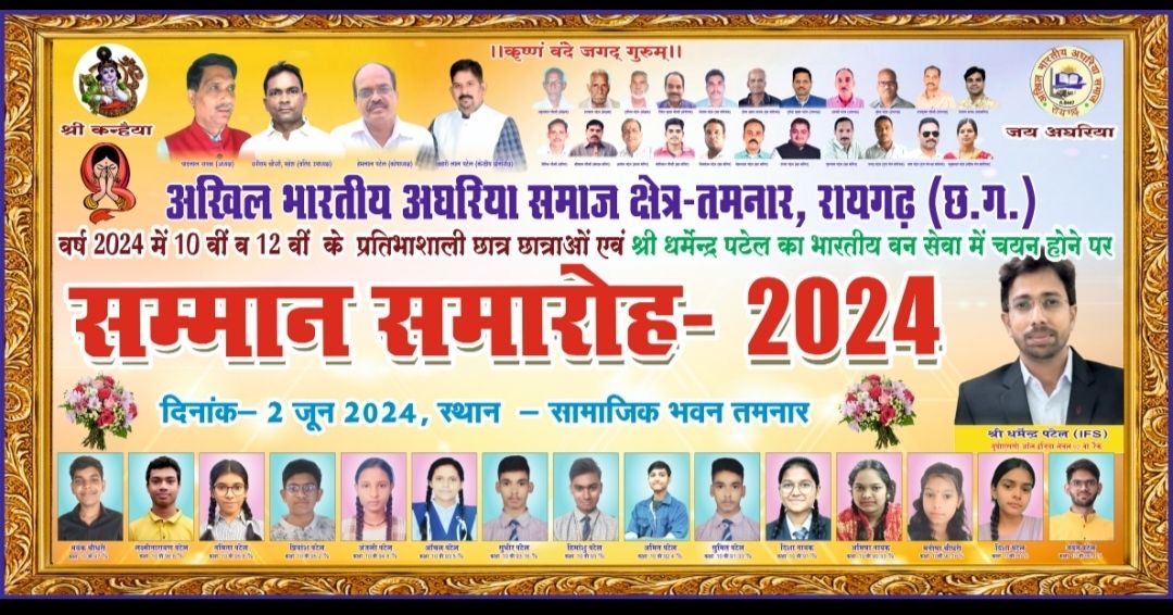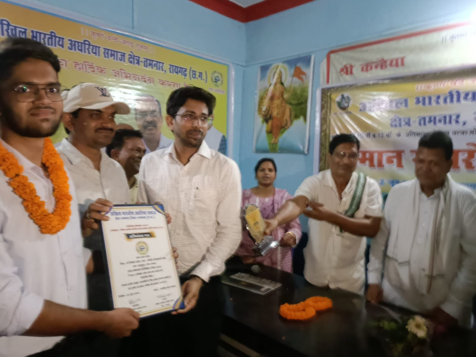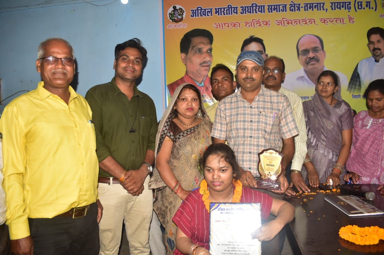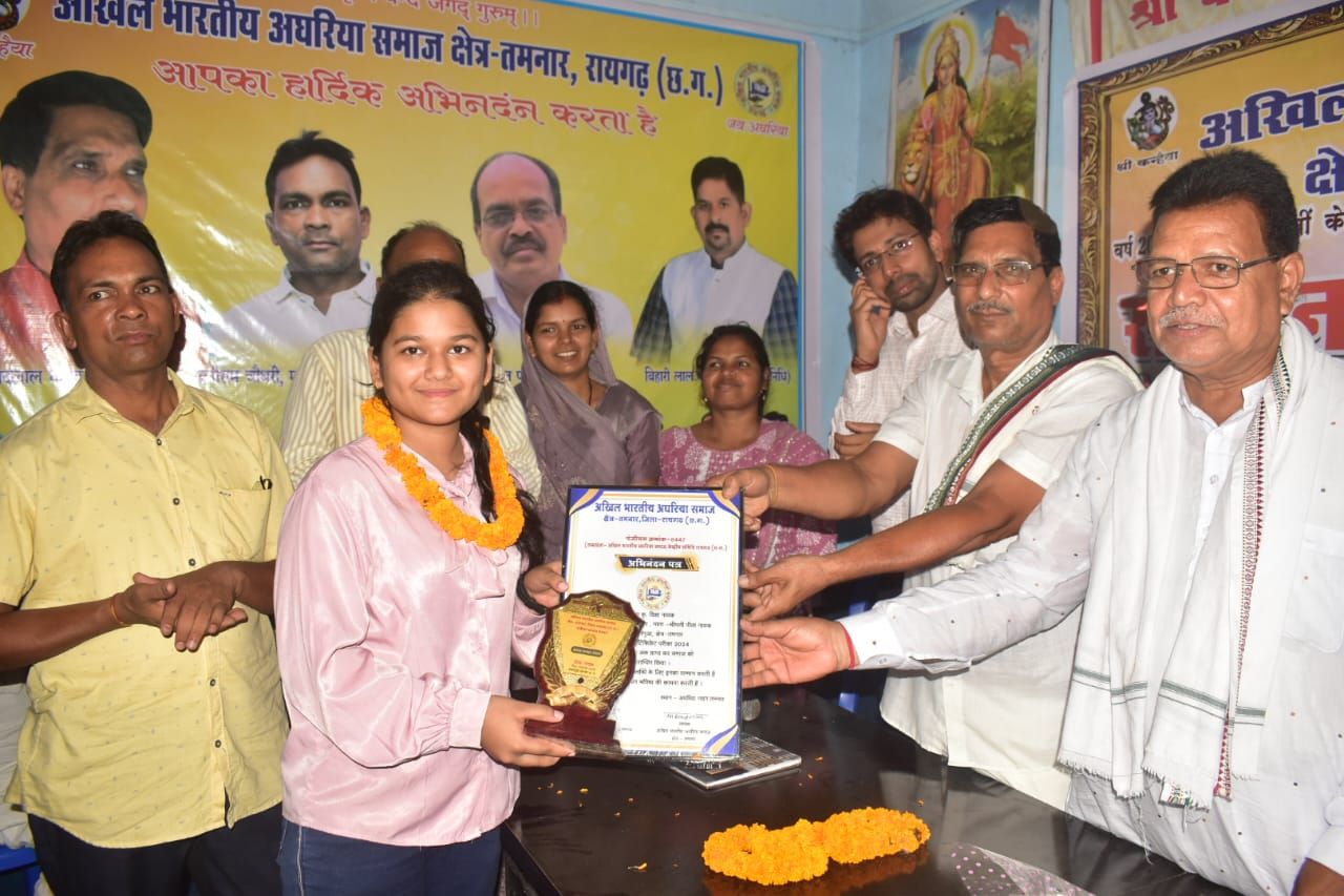 अखिल भारतीय अघरिया समाज क्षेत्र तमनार द्वारा 2जून रविवार को अघरिया सदन सामाजिक भवन तमनार में यादलाल नायक जी की अध्यक्षता में भारतीय वन सेवा के लिए चयन ऑल इंडिया लेवल 92 वां रैंक धर्मेन्द्र पटेल जी की मुख्य आतिथ्य में वर्ष 2024 में 10 वीं व 12 वीं के 90 प्रतिशत से अधिक अंक वाले प्रतिभाशाली छात्र छात्राओं को अभिनन्दन पत्र स्मृति चिन्ह भेंटकर सम्मानित किया गया।