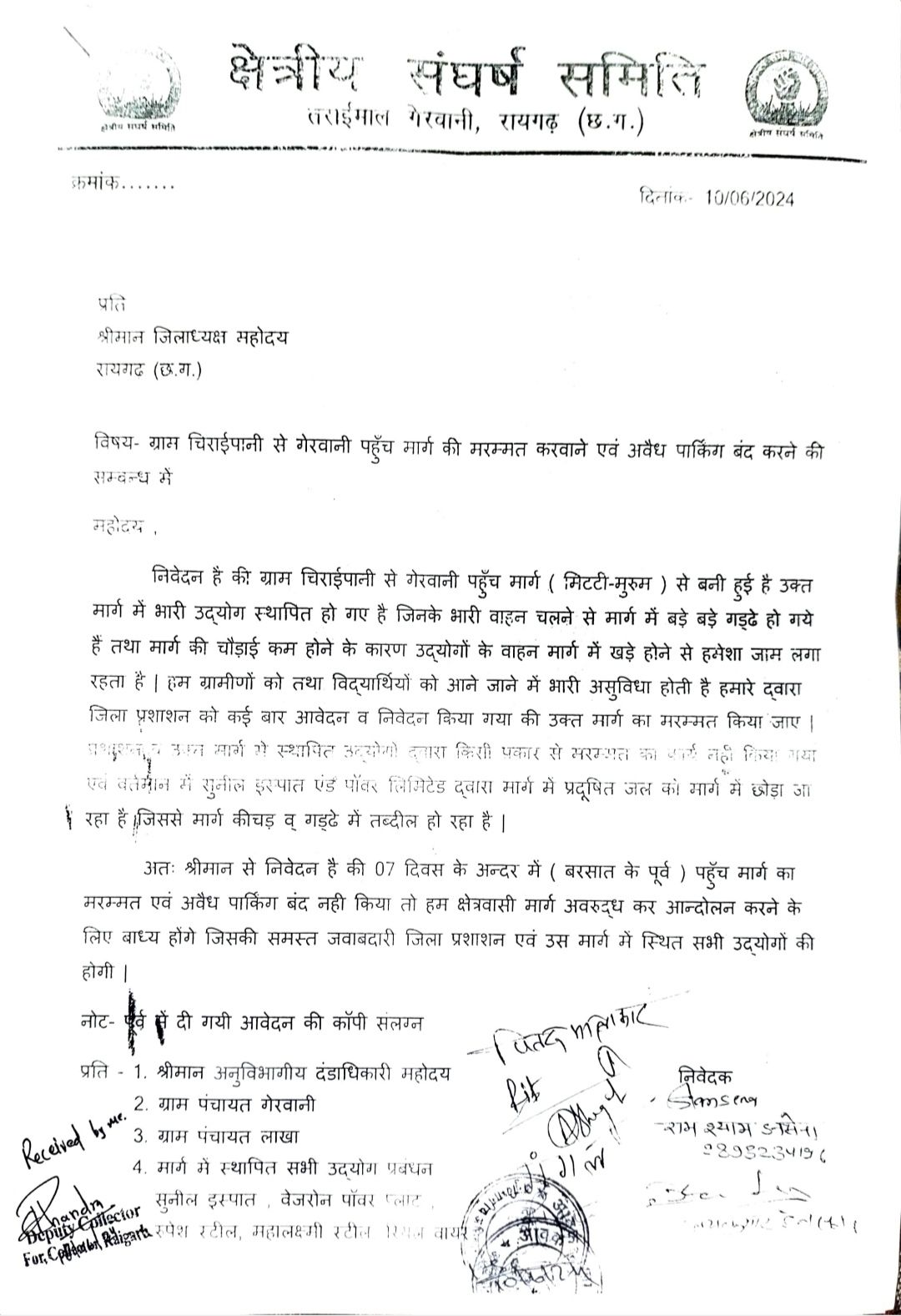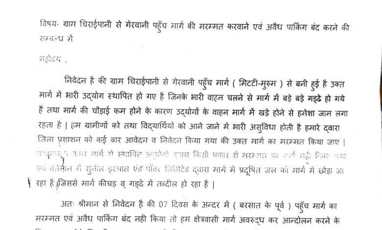 रायगढ़ जिले के ग्राम चिराईपानी से गेरवानी पहुँच मार्ग की मरम्मत करवाने एवं अवैध पार्किंग बंद करने की क्षेत्रीय संघर्ष समिति तराईमाल द्वारा कलेक्टर को आवेदन एवं प्रतिलिपि अनुविभागीय दंडाधिकारी रायगढ़ को दी गई है।