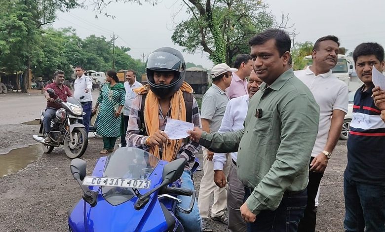 आज, रायगढ़-पूंजीपथरा मार्ग के उर्दना पुलिस लाइन के समीप, एसपी श्री दिव्यांग पटेल ने यातायात पुलिस और समाजसेवियों के साथ मिलकर नियम तोड़ने वाले वाहन चालकों को निशुल्क हेलमेट का वितरण किया। एसपी पटेल ने इस अवसर पर नागरिकों से अपील की कि वे स्वयं की सुरक्षा और परिवार की जिम्मेदारी को ध्यान में रखते हुए वाहन चलाते समय हमेशा हेलमेट पहनें।
