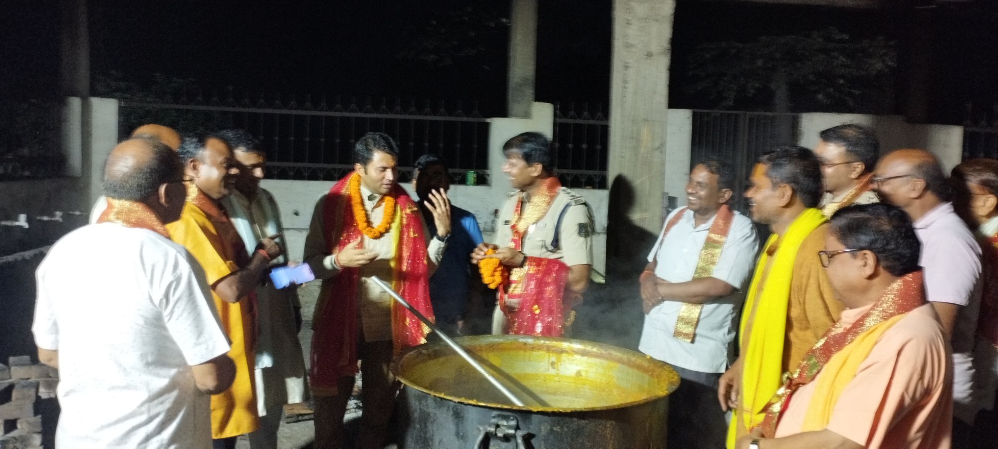 विशाल भण्डारा स्थल में लोगो को चावल दाल सब्जी खीर पूड़ी हलवा खिलाये। पाक शाला निरीक्षण करते भोजन चावल दाल रोटी सब्जियों मिठाइयों बनाने वालों से जानकारी लिए।