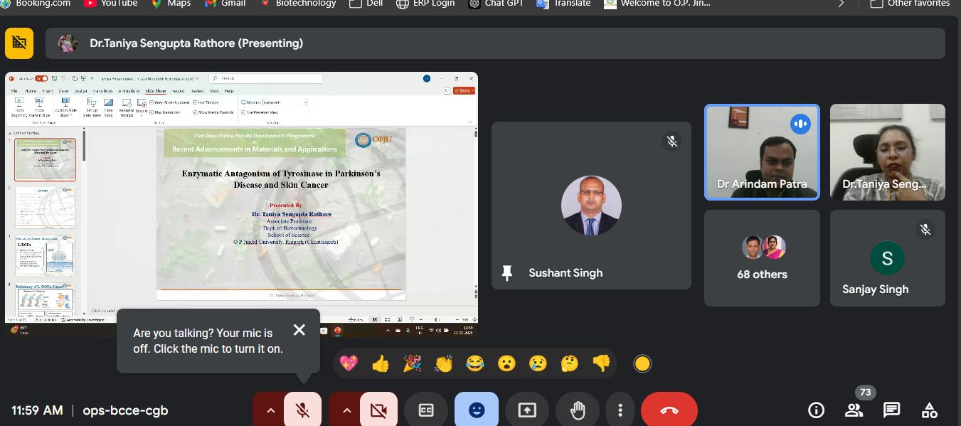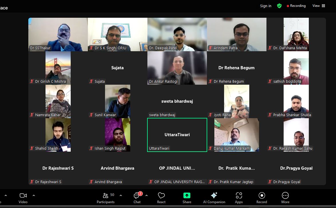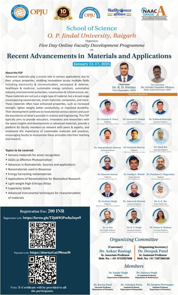 ओ पी जिंदल विश्वविद्यालय, रायगढ़ के स्कूल ऑफ़ साइंस द्वारा ‘रिसेंट एडवांसमेंट्स इन मैटेरियल्स एंड एप्लीकेशंस’ विषय पर पांच-दिवसीय फैकल्टी डेवलपमेंट प्रोग्राम का सफल आयोजन हुआ। ऑनलाइन माध्यम से 13 जनवरी से 17 जनवरी 2025 के दौरान आयोजित इस पांच-दिवसीय फैकल्टी डेवलपमेंट कार्यक्रम का संयोजन रसायन विभाग द्वारा किया गया। इस कार्यक्रम का उद्देश्य संकाय सदस्यों, शोधकर्ताओं और उद्योग के पेशेवरों को एक मंच पर लाकर मैटेरियल्स साइंस और इसके विभिन्न अनुप्रयोगों में हाल की प्रगति की एक व्यावहारिक समझ प्रदान करना और एक सहयोगी शिक्षण वातावरण को बढ़ावा देना था। साथ ही साथ शिक्षकों, नवप्रवर्तकों और शोधकर्ताओं को उन्नत सामग्रियों में नवीनतम अंतर्दृष्टि और वर्तमान रुझानों और प्रौद्योगिकियों पर नवीन जानकारी साझा करते हुए उन्नत सामग्रियों से संबंधित नई शिक्षण पद्धतियाँ और उपकरणों से परिचित कराना था। यह कार्यक्रम शोध, नवाचार और शिक्षण के क्षेत्र में नई दिशा देने के उद्देश्य से आयोजित किया गया था, जिसमें देशभर के प्रतिष्ठित शिक्षकों, विशेषज्ञों और शोधार्थियों ने भाग लिया और अपना ज्ञानवर्धन किया।