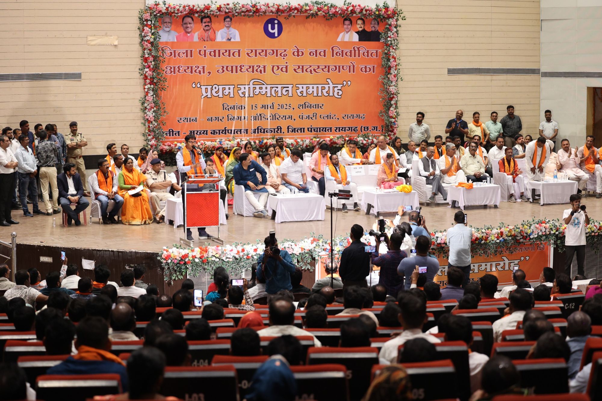 नगर निगम ऑडिटोरियम पंजरी प्लांट में आयोजित प्रथम सम्मिलन समारोह में जिला पंचायत के नवनिर्वाचित अध्यक्ष श्रीमती शीखा रविन्द्र गबेल व उपाध्यक्ष श्री दीपक सिदार सहित सभी नवनिर्वाचित जिला पंचायत सदस्य श्रीमती सुषमा खलखो, श्री गोपाल अग्रवाल, श्रीमती मुस्कान चौहान, श्रीमती लक्ष्मी जीवन पटेल, श्री ब्रजेश गुप्ता, श्रीमती भाग्यवती डोलनारायण नायक, श्री बलदेव कुर्रे, श्रीमती सतबाई छोटे लाल पटैल, श्री मुरलीधर राठिया, श्री रमेश बेहरा, श्री बंशीधर चौधरी, श्रीमती शांता भगत, श्रीमती रजनी राठिया, श्रीमती पूर्णिमा लाला सिंह बैगा, श्रीमती चन्द्रशेनी दुष्यंत राठिया, श्री पुनेश्वर प्रसाद राठिया ने पंचायती राज अधिनियमों के तहत पदीय दायित्वों के निर्वहन की शपथ ली।