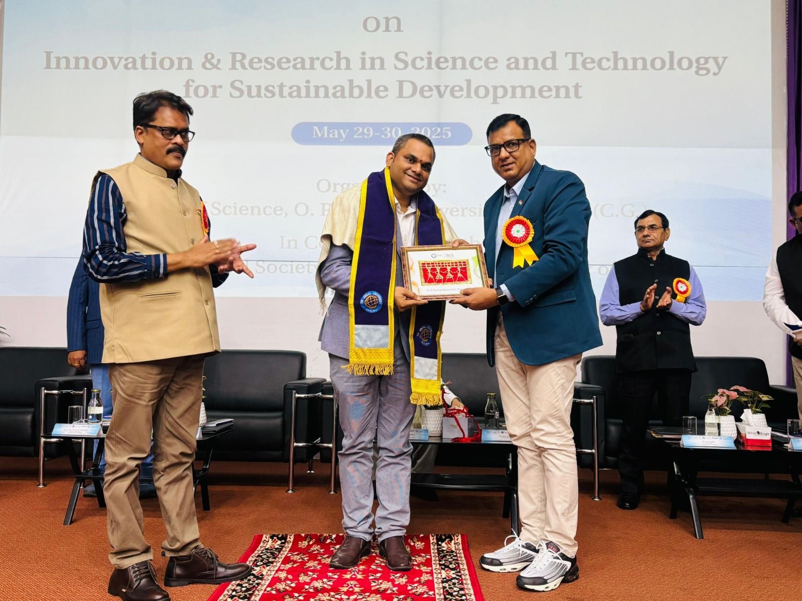 29 मई को आयोजित सम्मेलन के उदघाटन समारोह के मुख्य अतिथि डॉ. एल. पी. पटेरिया (कुलपति, शहीद नंदकुमार पटेल विश्वविद्यालय, रायगढ़), सम्मानित अतिथियों डॉ. अरुण त्रिपाठी (प्रोफेसर-गणित, संभलपुर विश्वविद्यालय, ओडिशा), डॉ. मारुति कश्यप (जीएनवी, सीईओ, वीबी ग्रुप, हैदराबाद, तेलंगाना), डॉ. एस.एस. राठी (प्लांट हेड, नलवा स्टील एंड पावर, रायगढ़), ओ.पी. जिंदल विश्वविद्यालय के कुलपति एवं सम्मेलन के चेयरमैन डॉ आर. डी. पाटीदार एवं कुलसचिव डॉ अनुराग विजयवर्गीय की उपस्थिति में सम्मलेन का उद्घाटन किया। समारोह की शुरुआत में डॉ. आर. डी. पाटीदार ने सभी सम्माननीय अतिथियों, वक्ताओं और प्रतिभागियों का हार्दिक स्वागत किया। उन्होंने सम्मेलन के उद्देश्यों पर प्रकाश डालते हुए बताया कि यह आयोजन मध्य भारत में एक महत्वपूर्ण और विशिष्ट सम्मेलन है, जो अनुप्रयुक्त विज्ञान, प्रौद्योगिकी, तथा अंतरविषयी क्षेत्रों में नवाचार, शोध और सतत विकास को केंद्र में रखकर आयोजित किया गया है। डॉ. पाटीदार ने कहा कि इस सम्मेलन का उद्देश्य विश्वभर के शिक्षाविदों, शोधकर्ताओं, उद्योग विशेषज्ञों और नीति निर्माताओं को एक मंच पर लाकर विचार-विमर्श, चिंतन एवं सहयोग के माध्यम से नवाचार और अनुसंधान को नई दिशा देना है। उन्होंने यह भी बताया कि ओ. पी. जिंदल विश्वविद्यालय विद्यार्थियों को “फ्यूचर रेडी” बनाने और अनुसंधान को प्रोत्साहित करने हेतु निरंतर प्रयासरत है। निकट भविष्य में विश्वविद्यालय द्वारा आरंभ किए जाने वाले शोध-आधारित पहलों की जानकारी भी उन्होंने साझा की। उन्होंने यह भी स्पष्ट किया कि यह सम्मेलन गुणवत्तापूर्ण शिक्षा, नवाचार और अनुसंधान के माध्यम से सतत विकास के लक्ष्यों को प्राप्त करने की दिशा में एक सार्थक पहल है, जो अकादमिक संस्थानों, उद्योगों और नीति निर्माताओं के बीच सहयोग एवं अनुभवों के आदान-प्रदान को बढ़ावा देता है। विशिष्ट अतिथियों डॉ. अरुण त्रिपाठी, डॉ. मारुति कश्यप और डॉ. एस. एस. राठी ने भी अपने विचार प्रस्तुत किए। उन्होंने इस बात पर बल दिया कि वर्तमान वैश्विक परिस्थितियों में नवाचार और अनुसंधान में निरंतरता बनाए रखना अत्यंत आवश्यक है, क्योंकि यही सतत विकास को मजबूती देगा। साथ ही उन्होंने यह भी रेखांकित किया कि शोध और नवाचार के साथ-साथ उद्यमिता को भी बढ़ावा देना समय की मांग है, जिससे आर्थिक और सामाजिक विकास को गति दी जा सके। सम्मेलन के उद्घाटन समारोह में मुख्य अतिथि के रूप में उपस्थित डॉ. एल. पी. पटेरिया ने अपने प्रेरणादायक उद्बोधन में अनुसंधान और नवाचार की महत्ता पर बल दिया। उन्होंने कहा कि सतत विकास एक ऐसा साझा उत्तरदायित्व है जिसे किसी एक क्षेत्र या अनुशासन के बलबूते पूरा नहीं किया जा सकता। इसके लिए इंजीनियरों, प