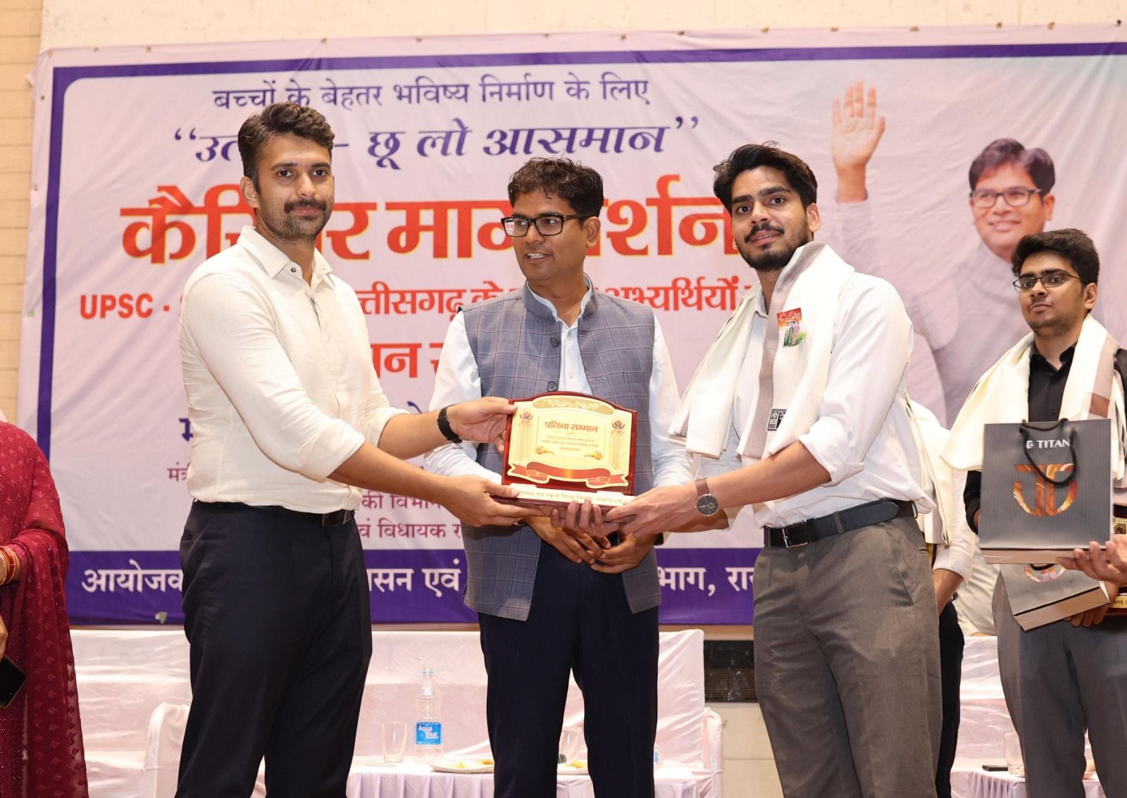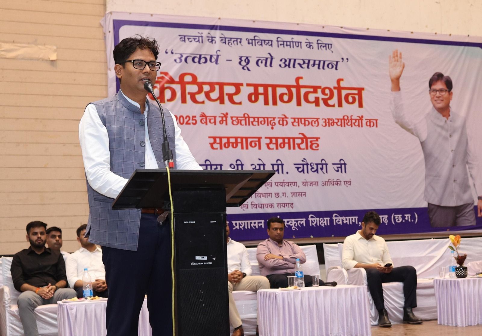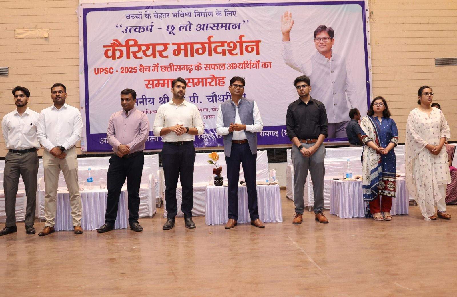 वित्त मंत्री श्री ओ.पी.चौधरी के मुख्य आतिथ्य में आज नगर निगम ऑडिटोरियम पंजरी प्लांट में मिशन उत्कर्ष-छू लो आसमान योजना अंतर्गत कैरियर मार्गदर्शन एवं यूपीएससी-2025 बैंच में छत्तीसगढ़ के सफल अभ्यर्थियों के लिए सम्मान समारोह का आयोजन हुआ। इस अवसर पर कलेक्टर श्री मयंक चतुर्वेदी, एसपी श्री दिव्यांग पटेल, सीईओ जिला पंचायत श्री जितेन्द्र यादव, सीएसपी श्री आकाश शुक्ला, डीएफओ श्री अरविंद पीएम उपस्थित रहे।