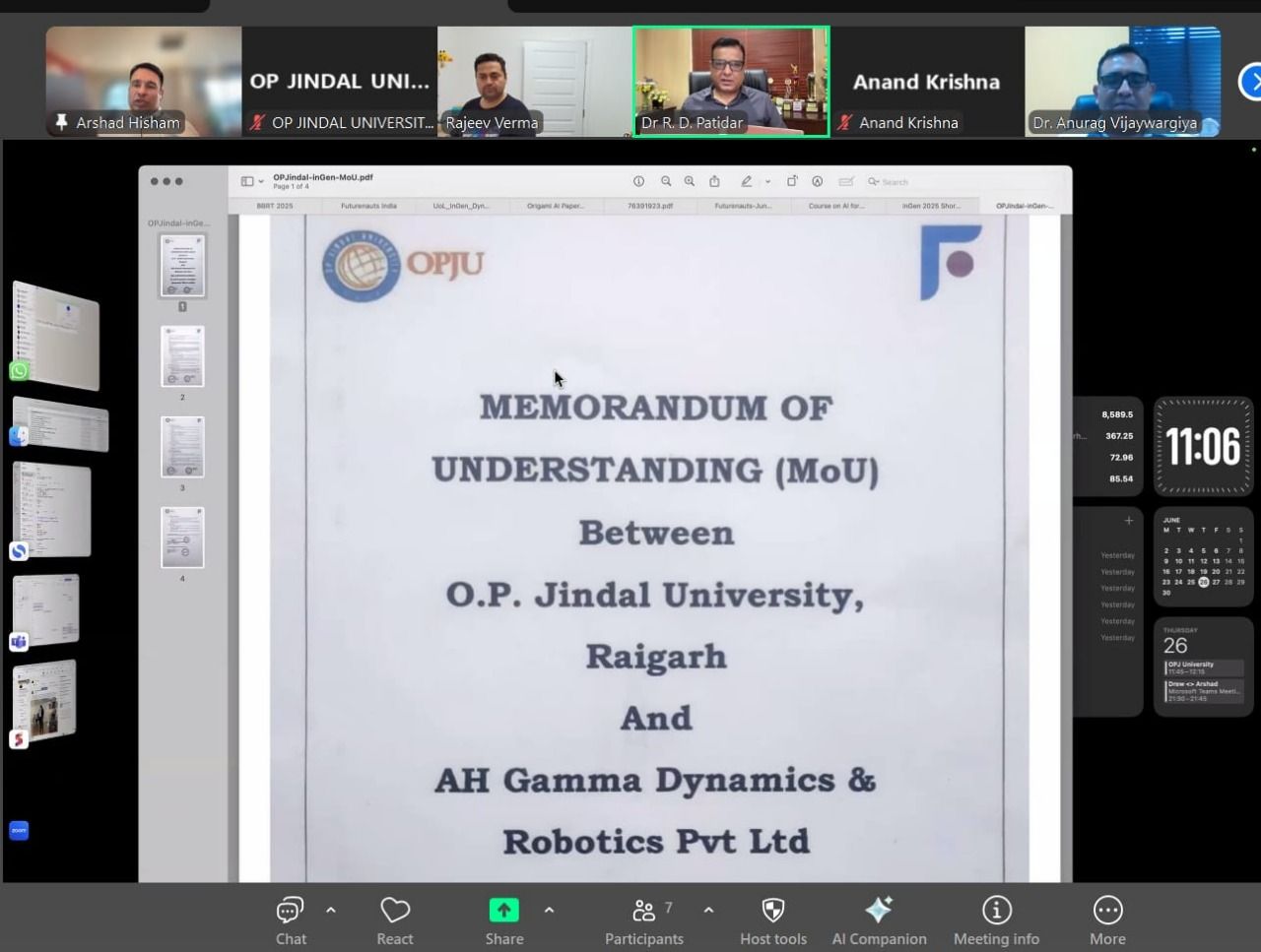 ओ.पी. जिंदल विश्वविद्यालय, रायगढ़ और अमेरिका की अग्रणी टेक्नोलॉजी कंपनी इनजेन डायनेमिक्स (inGen Dynamics) ने रोबोटिक्स और एआई में नवाचार को बढ़ावा देने के लिए समझौता ज्ञापन पर हस्ताक्षर किए। 26 जून, 2025 को आयोजित वर्चुअल मीटिंग में ओपीजेयू के कुलपति डॉ. आर. डी. पाटीदार एवं इनजेन डायनेमिक्स, यूएसए के संस्थापक और सीईओ श्री अरशद हिशाम ने, उभरती प्रौद्योगिकियों में अकादमिक-उद्योग सहयोग को बढ़ावा देने की दिशा में एक महत्वपूर्ण कदम में, ओ.पी. जिंदल विश्वविद्यालय और एएच गामा डायनेमिक्स एंड रोबोटिक्स प्राइवेट लिमिटेड (इनजेन डायनेमिक्स, यूएसए के अधिकृत अनन्य आरएंडडी पार्टनर) के प्रतिनिधि के रूप में रोबोटिक्स, आर्टिफिशियल इंटेलिजेंस (एआई) और स्वचालन में अनुसंधान, शिक्षा और विकास को आगे बढ़ाने के लिए एक समझौता ज्ञापन (एमओयू) पर हस्ताक्षर किए। इस विशेष अवसर पर डॉ. अनुराग विजयवर्गीय (रजिस्ट्रार, ओपीजेयू), श्री राजीव वर्मा (सीटीओ-इंजीनियरिंग स्ट्रैटेजी, इनजेन डायनेमिक्स, यूएसए), डॉ. सुरेंद्र द्विवेदी (निदेशक-आईएसडीएच, ओपीजेयू) एवं श्री आनंद कृष्ण (ईए टू वीसी, ओपीजेयू) उपस्थित रहे।