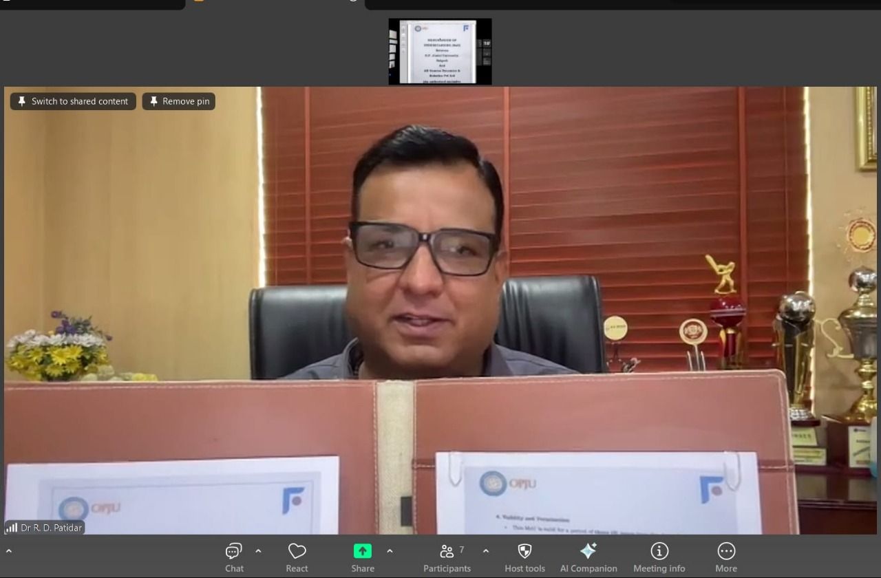 (ओपीजेयू और अमेरिका की अग्रणी टेक्नोलॉजी कंपनी इनजेन डायनेमिक्स ने मिलाया हाथ, रोबोटिक्स और आर्टिफिशियल इंटेलिजेंस (AI) के क्षेत्र में अनुसंधान, शिक्षा और नवाचार को नया आयाम देने के लिए किए समझौता ज्ञापन पर हस्ताक्षर)
