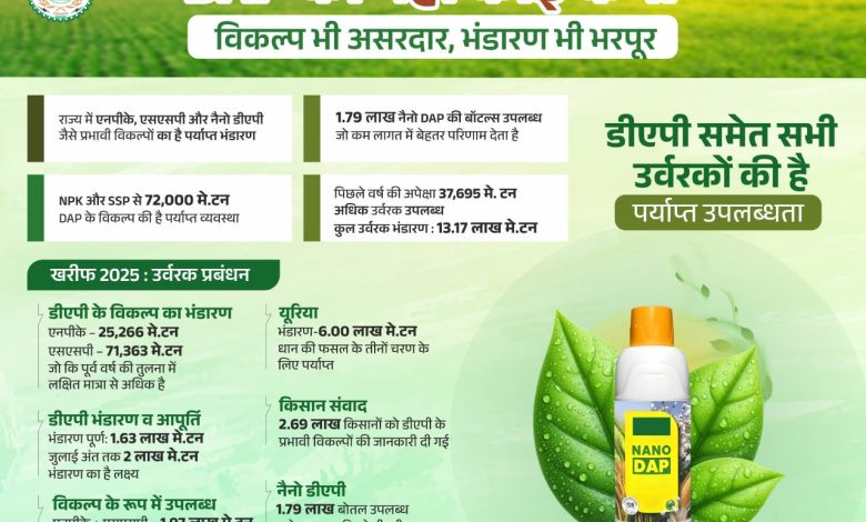 राज्य में रासायनिक उर्वरको कोई कमी नहीं हैं। खरीफ सीजन 2025 के लिए सभी प्रकार के रासायनिक उर्वरक सहकारी समितियों एवं नीजि विक्रय केंद्रों में पर्याप्त मात्रा में उपलब्ध हैं। वैश्विक परिस्थिति के चलते डीएपी खाद के आयात में कमी को देखते हुए प्रदेश सरकार द्वारा इसके विकल्प के रूप में अन्य रासायनिक उर्वरकों की भरपूर आपूर्ति एवं वितरण की व्यवस्था सुनिश्चित की गई है।