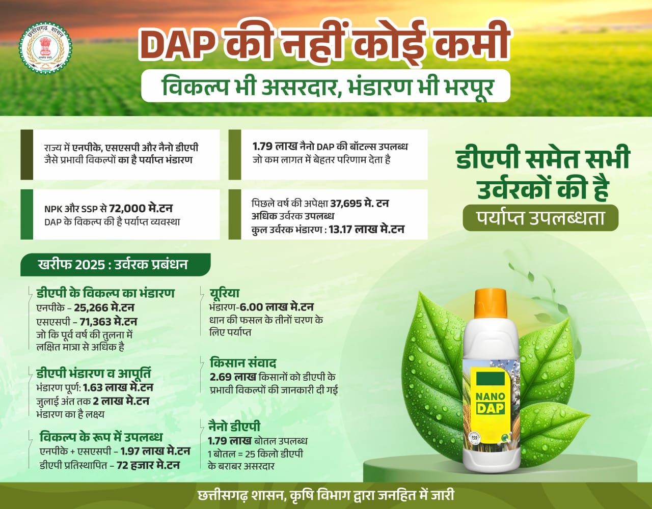 मुख्यमंत्री श्री विष्णु देव साय ने कहा है कि डीएपी खाद की कमी को लेकर किसानों को परेशान होने की जरूरत नहीं है। इसके विकल्प के रूप में छत्तीसगढ़ सरकार द्वारा अन्य रासायनिक उर्वरक जैसे- नैनो डीएपीए एनपीके और एसएसपी की भरपूर व्यवस्था सुनिश्चित की गई है। इंदिरा कृषि विश्वविद्यालय के कृषि वैज्ञानिकों और कृषि विभाग के अधिकारियों के सुझाव के अनुरूप किसान डीएपी के बदले उक्त उर्वरकों का प्रयोग कर बेहतर उत्पादन प्राप्त कर सकते हैं। सोसायटियों से किसानों को उनकी डिमांड के अनुसार खाद-बीज का पर्याप्त भंडारण किया गया है।