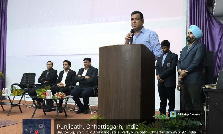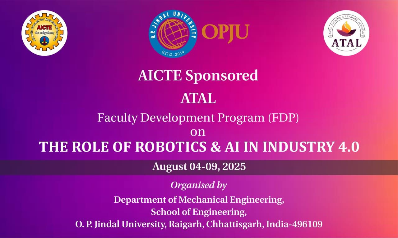 ओ. पी. जिंदल विश्वविद्यालय, रायगढ़ के स्कूल ऑफ इंजीनियरिंग के मैकेनिकल इंजीनियरिंग विभाग द्वारा “रोबोटिक्स एवं आर्टिफिशियल इंटेलिजेंस की इंडस्ट्री 4.0 में भूमिका” विषय पर एक सप्ताह का अटल फैकल्टी डेवलपमेंट प्रोग्राम (FDP) आयोजन 4 अगस्त 2025 से 9 अगस्त 2025 तक किया जा रहा है। यह कार्यक्रम एआईसीटीई (AICTE) की अटल (ATAL) अकादमी के तत्वावधान में आयोजित किया जा रहा है, जिसका उद्देश्य शिक्षकों और शोधकर्ताओं को रोबोटिक्स, आर्टिफिशियल इंटेलिजेंस और आधुनिक उद्योगों में उनके अनुप्रयोगों के नवीनतम रुझानों से अवगत कराना है।