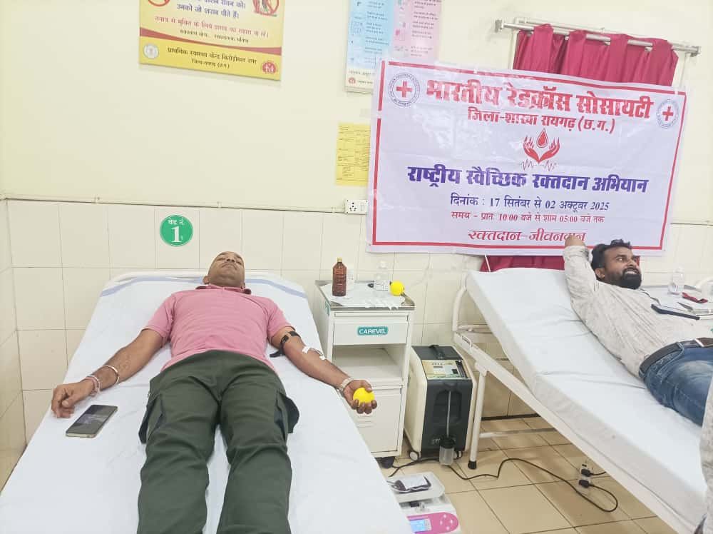 इस वर्ष स्वैच्छिक रक्तदान दिवस (01 अक्टूबर 2025) का स्लोगन है “Give Blood, Give Hope–Together We Save Lives” जो इस अभियान की भावना को सार्थक रूप में अभिव्यक्त करता है। अभियान के अंतर्गत 18 सितम्बर को सामुदायिक स्वास्थ्य केन्द्र तमनार में आयोजित शिविर में 57 यूनिट तथा 19 सितम्बर को प्राथमिक स्वास्थ्य केन्द्र किरोड़ीमल नगर में आयोजित शिविर में 24 यूनिट रक्त संग्रह किया गया। इन शिविरों में नगरवासियों, ग्रामीणों एवं स्वयंसेवी संस्थाओं ने उत्साहपूर्वक भाग लिया। रक्तदाताओं को इस अवसर पर स्वैच्छिक रक्तदान को जीवनचर्या का हिस्सा बनाने एवं समाज में रक्तदान के प्रति सकारात्मक संदेश फैलाने की शपथ भी दिलाई गई। रेडक्रॉस रायगढ़ की ओर से बताया गया कि सेवा पखवाड़े के दौरान आगामी 01 अक्टूबर को वृहद रक्तदान शिविर आयोजित किया जाएगा, जिसके लिए अभी से रक्तदाताओं का पंजीयन किया जा रहा है।