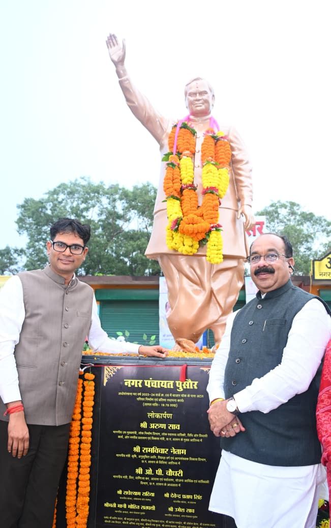 बरसात के बीच भी नगर पंचायत पुसौर में आज विकास के प्रति नागरिकों का उत्साह देखते ही बन रहा था। यह अवसर था 15 करोड़ 31 लाख रुपये की लागत के विभिन्न विकास कार्यों के लोकार्पण एवं शिलान्यास का। इस अवसर पर उप मुख्यमंत्री श्री अरुण साव एवं वित्त मंत्री श्री ओ.पी. चौधरी मुख्य अतिथि के रूप में उपस्थित रहे। उन्होंने नगर पंचायत पुसौर के बाजार चौक में 19.78 लाख रुपये की लागत से अटल परिसर निर्माण व भारत रत्न एवं पूर्व प्रधानमंत्री स्वर्गीय श्री अटल बिहारी वाजपेयी की आदमकद प्रतिमा का अनावरण किया तथा राष्ट्र निर्माण में उनके अमूल्य योगदान को नमन किया।
