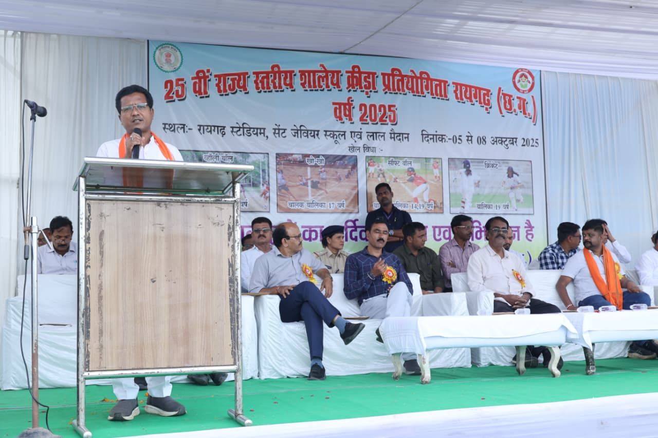रायगढ़ में आयोजित 25वीं राज्य स्तरीय शालेय क्रीड़ा प्रतियोगिता का आज भव्य समापन हुआ। चार दिवसीय इस प्रतियोगिता में प्रदेश के सभी पाँच संभाग रायपुर, बिलासपुर, बस्तर, सरगुजा और दुर्ग से आए प्रतिभाशाली खिलाड़ियों ने उत्कृष्ट खेल भावना का प्रदर्शन करते हुए अपनी प्रतिभा का परिचय दिया। रायगढ़ स्टेडियम में आयोजित समापन समारोह में मुख्य अतिथि के रूप में लोकसभा सांसद श्री राधेश्याम राठिया ने मां सरस्वती के छायाचित्र पर दीप प्रज्वलित कर कार्यक्रम का विधिवत शुभारंभ किया। पीटीआई टीम द्वारा मुख्य अतिथि एवं गणमान्य अतिथियों का बैच लगाकर स्वागत किया गया।