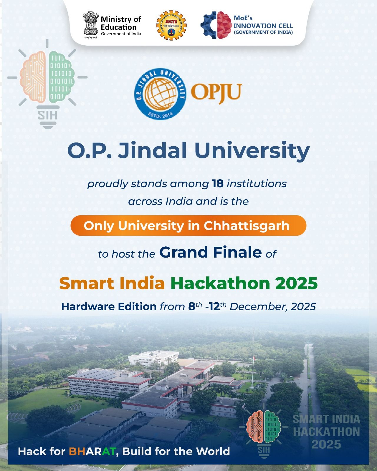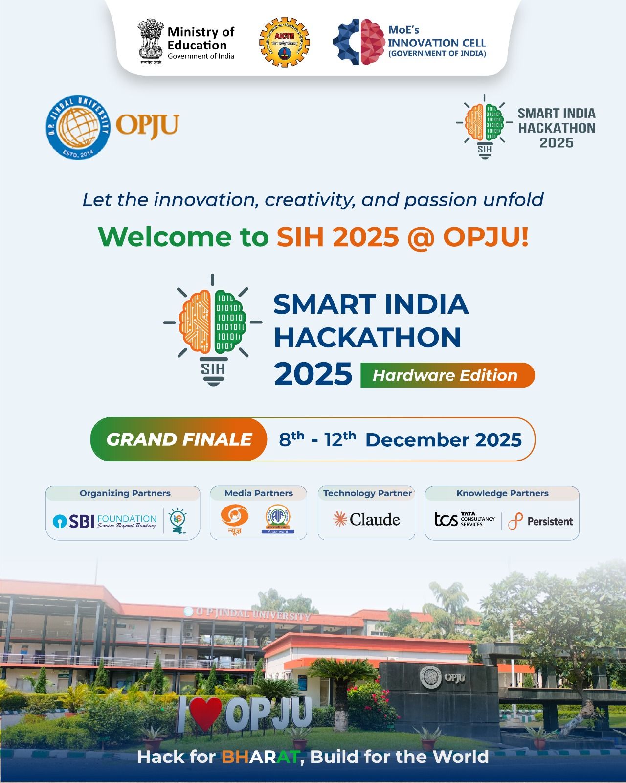 स्मार्ट इंडिया हैकथॉन (SIH)–2025 (हार्डवेयर एडिशन) के ग्रैंड फिनाले का भव्य आयोजन 8 दिसंबर से ओ.पी. जिंदल विश्वविद्यालय में