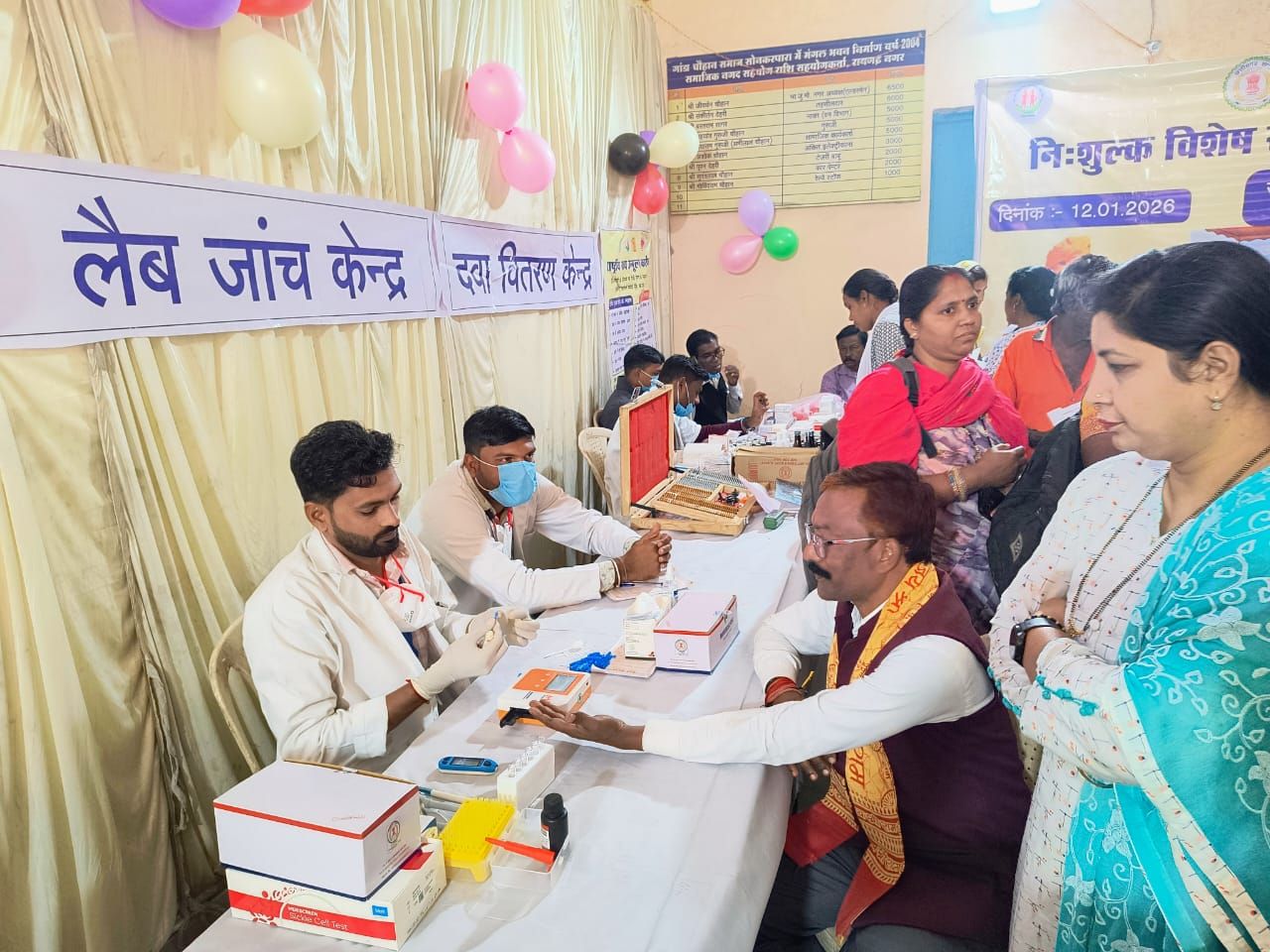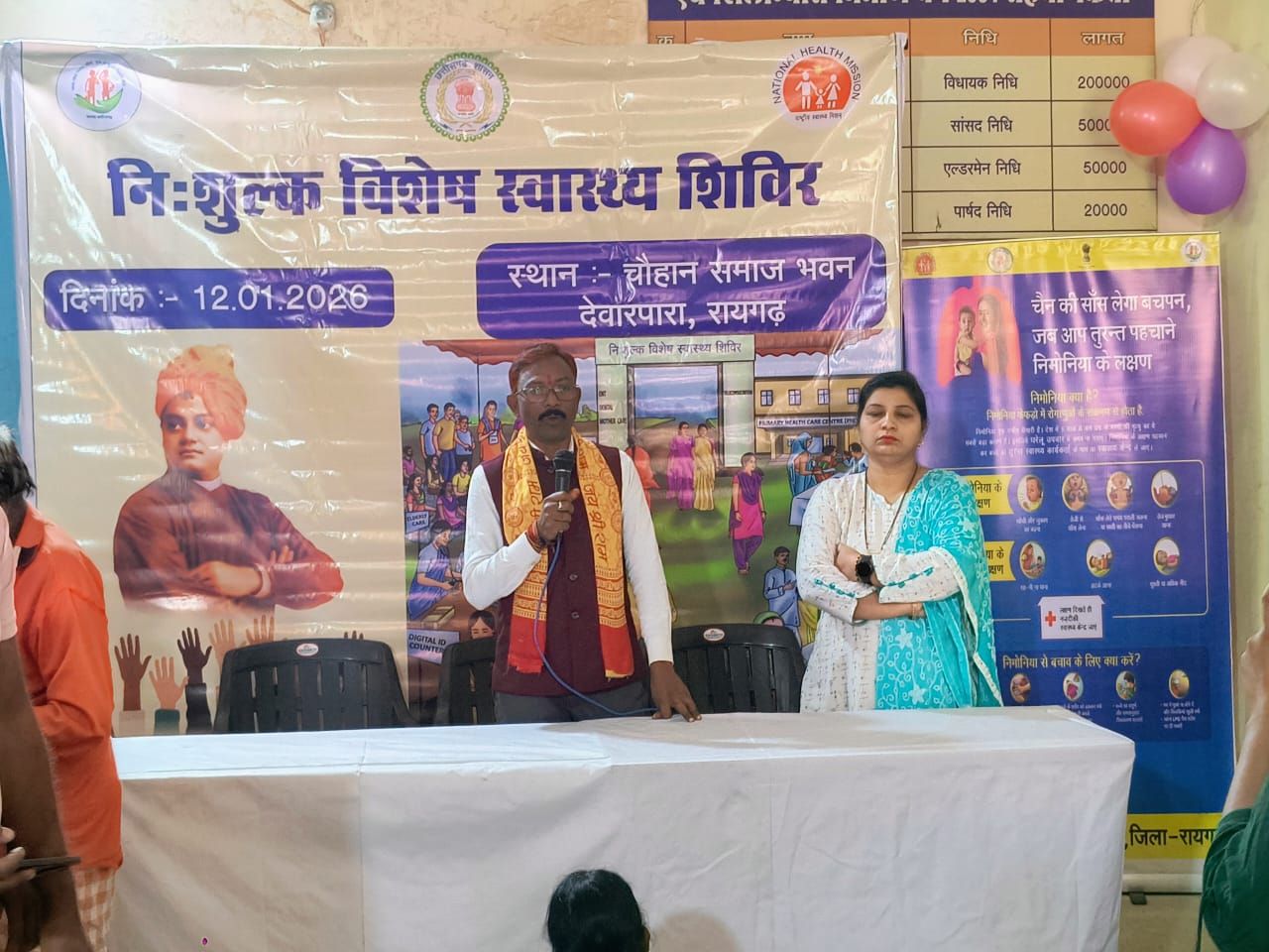 राष्ट्रीय शहरी स्वास्थ्य मिशन, जिला रायगढ़ के अंतर्गत आज चौहान समाज भवन, देवारपारा रायगढ़ में निःशुल्क आउटरीच विशेष स्वास्थ्य शिविर का आयोजन किया गया। इस अवसर पर महापौर श्री जीवर्धन चौहान ने शिविर स्थल का निरीक्षण किया और विभिन्न जांच काउंटरों का अवलोकन कर हितग्राहियों से चर्चा की। उन्होंने स्वयं भी स्वास्थ्य जांच करवाई और स्वास्थ्य सेवाओं की गुणवत्ता का प्रत्यक्ष अनुभव लिया। महापौर ने कहा कि ऐसे शिविर शहरी नागरिकों को समय पर निःशुल्क एवं गुणवत्तापूर्ण स्वास्थ्य सेवाएं उपलब्ध कराने में महत्वपूर्ण भूमिका निभाते हैं।