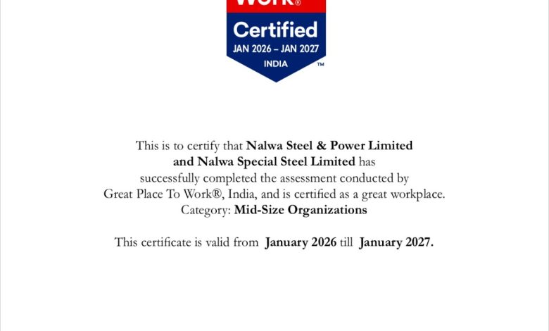 अंचल क्षेत्र की अग्रणी कंपनियों नलवा स्टील एंड पावर लिमिटेड एवं नलवा स्पेशल स्टील लिमिटेड ने स्टील और पावर क्षेत्र में अपनी उत्कृष्टता को एक बार फिर साबित किया है। ग्रेट प्लेस टू वर्क इंस्टीट्यूट इंडिया ने जनवरी 2026 से जनवरी 2027 की अवधि के लिए इन्हें ‘कार्य के लिए बेहतरीन स्थल (Great Place to Work) तथा “उत्कृष्ट कार्य संस्कृति” (Excellent Workplace Culture) के लिए प्रमाण पत्र प्रदान किया है। यह सम्मान लगातार तीसरी बार प्राप्त किया गया है, जो कंपनी की कर्मचारी-केंद्रित नीतियों और सकारात्मक कार्य वातावरण की मजबूत पहचान की दर्शाता है।