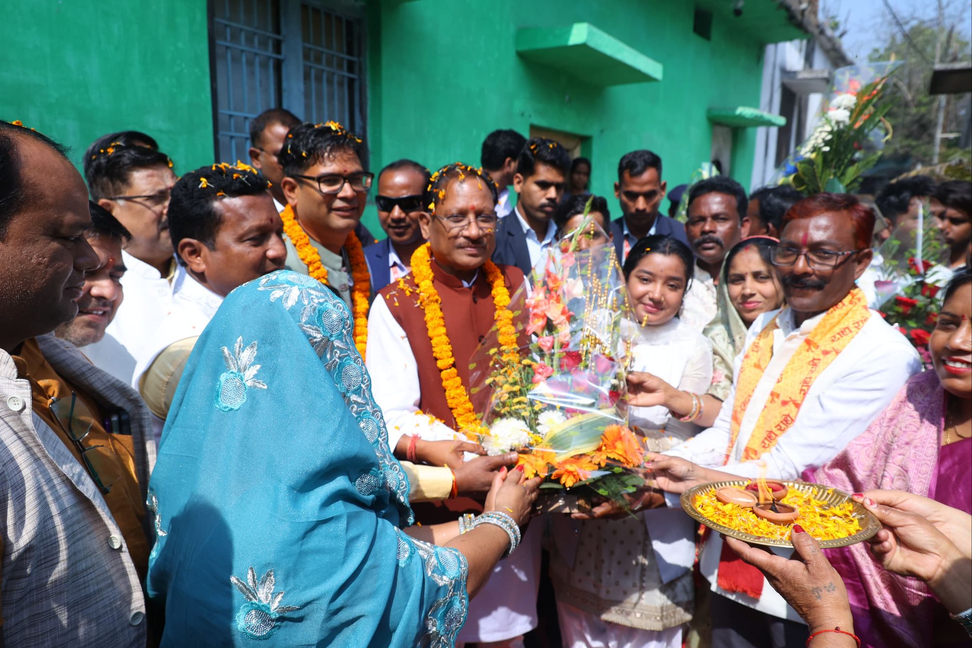*मुख्यमंत्री के स्वागत में रंगोली से सजा मुख्य द्वार, आरती-पुष्पवर्षा से हुआ आत्मीय स्वागत