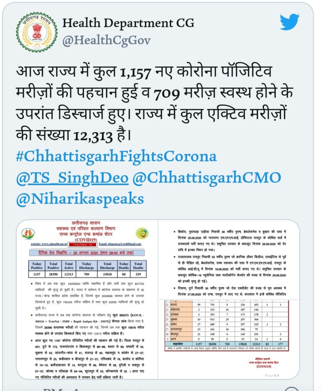 रायपुर 29.8.2030छत्तीसगढ़ में आज कोरोना कहर जारी है हम बात करेंगे आंकड़ा का तो लंबा चौराहा आंकड़ा आज आया है आंकड़ा फिर 1513 नये मरीज मिले हैं। पिछले एक सप्ताह से छत्तीसगढ़ में मरीजों की संख्या 1000 से ज्यादा आ रही है। वहीं कुल मरीजों की संख्या 28746 पहुंच गयी है। वहीं एक्टिव केस अब छत्तीसगढ़ में 12666 हो गये हैं। हालांकि आज कुल 709 मरीजों को अस्पताल से डिस्चार्ज भी किया गया। वहीं 24 घंटे में प्रदेश में 11 मरीजों ने कोरोना की वजह से दम तोड़ा। इस आंकड़े के साथ प्रदेश में अब कुल मौत की संख्या 262 पहुंच गयी है।जिलेवार आंकड़ों को देखें तो रायपुर में अभी तक 630 नये कोरोना मरीज मिले हैं, वहीं दुर्ग में 187 नये केस आये हैं। राजनांदगांव में 66, बिलासपुर में 66, बस्तर में 59, धमतरी में 44, सुकमा में 43, जांजगीर में 41, रायगढ़ में 61, महासमुंद में 34, कांकेर में 27, मुंगेली में 23, नारायणपुर में 23, कवर्धा में 21, बीजापुर में 21, गरियाबंद में 24, बालोद में 15, कोरिया में 15, बलौदाबाजार में 16, सरगुजा में 18, बेमेतरा में 26, मुंगेली में 7, जशपुर में 7, कोरबा में 20, बलरामपुर में8, दंतेवाड़ा में 4, सूरजपुर में 3 और कोंडागांव में 2 लोग कोरोना पॉजेटिव पाये गये हैं।रायगढ़ जिले में 58 नए कोरोना मरीजों की पहचान..