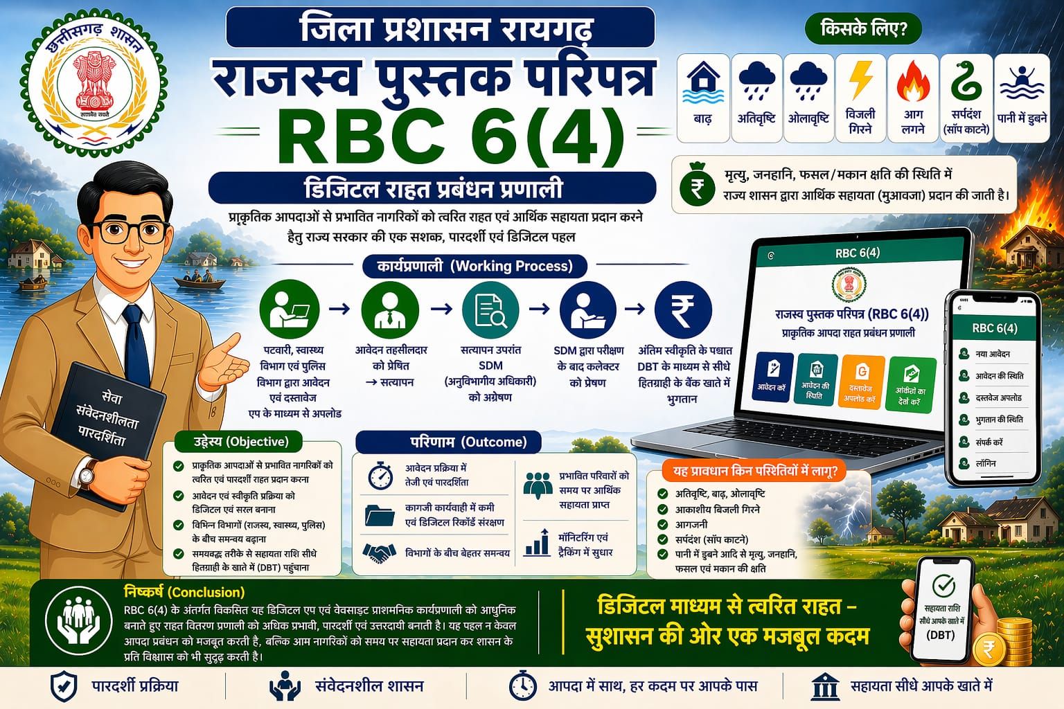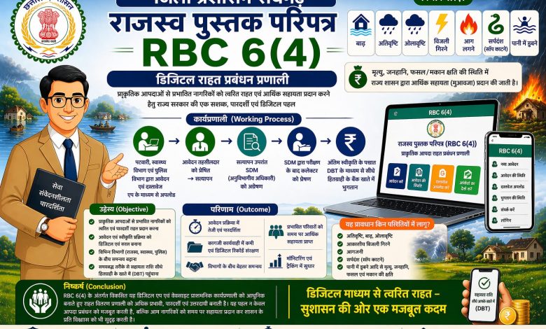 आरबीसी 6(4)’ डिजिटल राहत प्रबंधन प्रणाली के लागू होने से प्रशासनिक कार्यप्रणाली में न केवल तेजी आएगी, बल्कि पारदर्शिता और जवाबदेही भी सुनिश्चित होगी। कागजी प्रक्रिया में कमी आने से कार्य आसान होगा और डिजिटल रिकॉर्ड के माध्यम से सभी प्रकरणों का सुरक्षित एवं व्यवस्थित संधारण संभव होगा। साथ ही ऑनलाइन मॉनिटरिंग एवं ट्रैकिंग प्रणाली के जरिए प्रत्येक आवेदन की स्थिति पर सतत नजर रखी जा सकेगी, जिससे समय-सीमा में निराकरण सुनिश्चित होगा। विभागों के बीच बेहतर समन्वय स्थापित होने से कार्य निष्पादन की गुणवत्ता में भी सुधार आएगा। यह पहल प्रभावित नागरिकों को समय पर आर्थिक सहायता उपलब्ध कराने के साथ-साथ शासन के प्रति विश्वास को और अधिक सुदृढ़ करेगी।