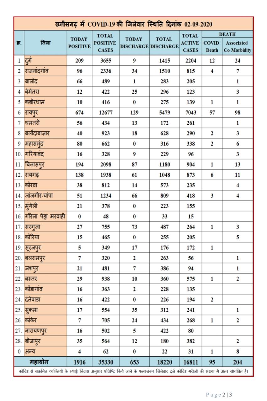 2 सितम्बर को छ ग प्रदेश में 1916 रायगढ़ जिले में 138 नए कोरोना पॉजिटिव मरीजों की पुष्टि …
