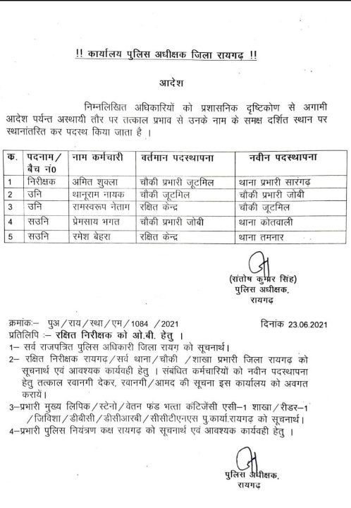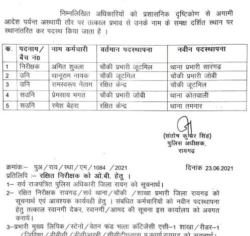 रायगढ़ पुलिस अधीक्षक ने पाँच थाना प्रभारियों का किया फेरबदल…देखिये आदेश