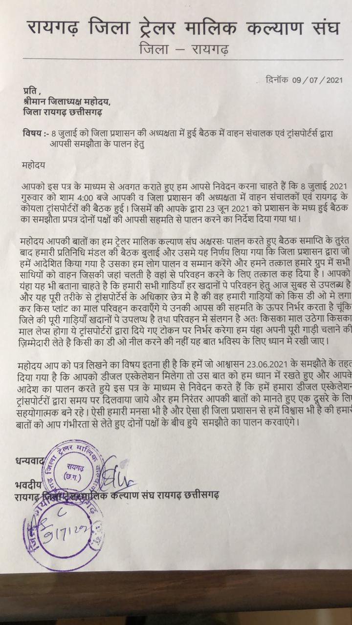 इसी विषय को लेकर टेलर मालिक संघ ने एक विज्ञप्ति जारी करते हुए बताया कि वाहन संचालकों एवं कोयला ट्रांसपोर्टरों को अपने अपने वादे पर कायम रहते हुए कार्य करना पड़ेगा। वहीं मुख्य मुद्दा डीजल एस्केलेशन पर अपर कलेक्टर कुरुवंशी ने वाहन संचालकों को स्पष्ट कहा है कि वह जितना कार्य करेंगे और जितना कोयला का परिवहन करेंगे और जिस खदानों से करेंगे। उन्हें उनका हक डीजल एस्केलेशन मिलेगा। अगर इसके ऊपर इसी ने आनाकानी की या आपसी समझौते का पालन नहीं किया तो उसके लिए हम यहां बैठे हुए हैं।