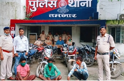 रायगढ़ जिले के तमनार थाना में बीते दिनों मोटरसाइकिल चोरी की शिकायत दर्ज कराई गई थी जहां एक मोटरसाइकिल तमनार सामुदायिक स्वास्थ्य केंद्र में काम करने वाले लेब टेक्नीशियन कमलेश कुमार पटेल की थी तो वहीं दूसरी जेपीएल के गेट नंबर 3 से चोरी हुई थी ।रिपोर्ट दर्ज होने के पश्चात रायगढ़ पुलिस अधीक्षक संतोष कुमार सिंह,एडीशनल एसपी अभिषेक वर्मा व धरमजयगढ़ एसडीओपी सुशील कुमार नायक को तमनार थाना प्रभारी अभिनवकांत सिंह ने अवगत कराया गया था । जिसके बाद पुलिस अधीक्षक ने तत्काल मामले को संज्ञान में लेकर जिले में होने वाली लगातार लूट,डकैत व चोरियों होने से तमनार थाना प्रभारी के समस्त स्टाफ को अलग अलग टीम बनाकर थाना के अंतर्गत सभी गांवों में जाकर पतासाजी करने व अपने सूचना तंत्र को मजबूत करने के निर्देश दिए गए। इसको गंभीरता से लेते हुए तमनार थाना के आरक्षक अरविंद पटनायक ने अपने सूचना तंत्र को मजबूत किया और चोर गिरोह सरगना तक पहुंचा। जहां एक टीम तमनार थाना प्रभारी अभिनवकांत सिह , ए एस आई आशिक रात्रे , आरक्षक अरविंद पटनायक , कमलेश्वर सिंह , एवं अश्वनी सिदार की टीम उड़ीसा बॉर्डर पर पतासाजी कर रही थी।तभी अरविंद पटनायक को सूचना मिली कि भोला शंकर केवट डभरा निवासी तमनार क्षेत्र के मोटरसाइकिल को चोरी कर उड़ीसा की ओर भेजता है। पुनिलाल खड़िया लैलूंगा क्षेत्र से मोटरसाइकिल चोरी उडीसा की ओर भेजता है एवं परमेश्वर माझी उड़ीसा लाने वाले मोटरसाइकिल का उड़ीसा प्रांत में बेचता है।इसकी सूचना पर तीनों आरोपियों को घेरा बंदी कर पकड़ा गया आरोपियों के पास से 12 नग मोटर साइकिल बरामद किया गया है आरोपियों के ऊपर अपराध पंजीबद्ध कर कार्यवाही की जा रही है। चोरी के मोटरसाइकिल में कुछ मोटरसाइकिल पूंजीपथरा थाना मामले से हैं तो कुछ घरघोड़ा थाना के मामले हैं।वर्सन