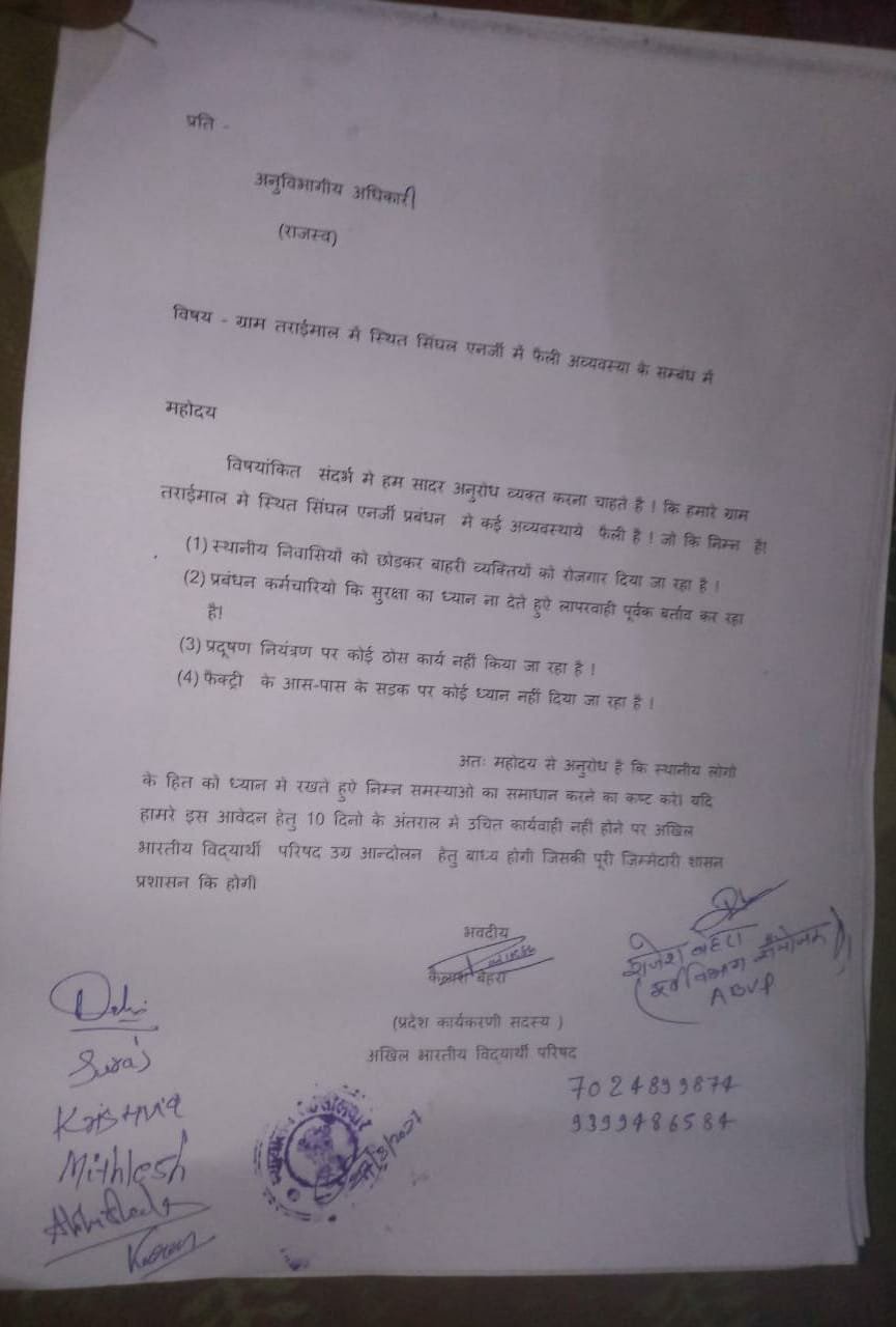 पूर्व विभाग संयोजक विद्यार्थी परिषद व वर्तमान भारतीय जनता युवा मोर्चा के महामंत्री राजेश बेहरा,अखिल भारतीय विद्यार्थी परिषद में प्रदेश कार्यकारिणी सदस्य छात्र नेता कैलाश बेहरा व सूरज भगत का कहना है कि अगर इन मांगों पर 10 दिनों के अंतराल में कोई ठोस कदम नही उठाया जाता है तो अखिल भारतीय विद्यार्थी परिषद सिंघल प्रबंधन के खिलाफ बेरोजगारी, पर्यावरण प्रदूषण, सेफ्टी व अन्य मुद्दों को लेकर सड़क पर उतरकर शांतिपूर्ण आंदोलन करेगी।जिसका सम्पूर्ण जिम्मेदारी प्लांट प्रबंधन व शासन प्रशासन की होगी।