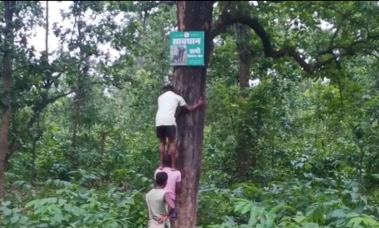 मेंढरमार सड़क किनारे पेड़ में हाथी से जागरूक रखने बिना कोई सुरक्षा के बिट गार्ड द्वारा लगवाया जा रहा पोस्टर