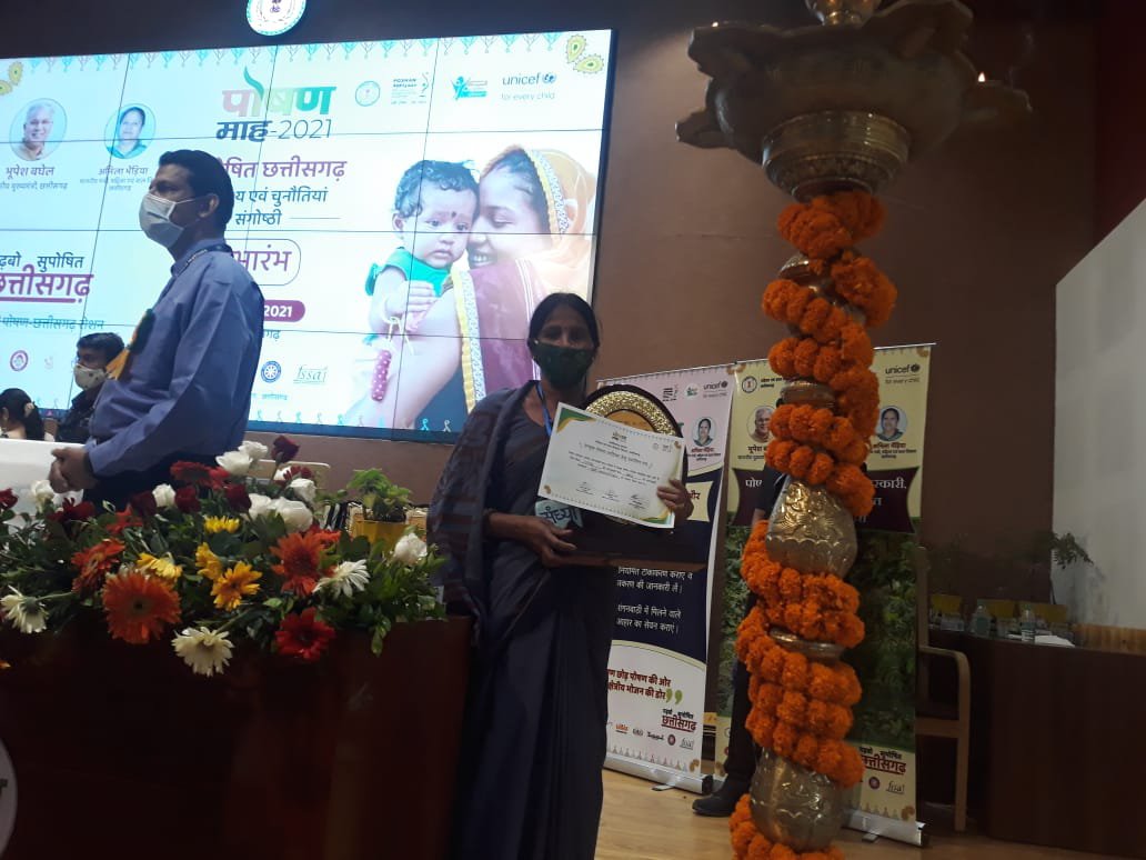 पोषण माह के तौर पर पूरे राज्य में मनाया जा रहा है। जिले में भी इसके तहत हर दिन कुछ न कुछ कार्यक्रम और गतिविधियाँ तय किया गया है। एक सितंबर को महिला एवं बाल विकास विभाग, जिंदल और अडानी समूह के संयुक्त तत्वाधान में पोषण रथ के निकालने के साथ ही पोषण माह की शुरुआत हुई। इसके तेहरवें दिन एक खुशखबरी यह आई है कि तमनार सेक्टर के भगोरा आंगनबाड़ी के पोषण वाटिका को राज्य स्तरीय पुरस्कार रायपुर में मिला है। सोमवार को रायपुर में पोषण सम्मेलन हुआ जिसमें महिला एवं बाल विकास के जिला कार्यक्रम अधिकारी टीके जाटवर, शहरी क्षेत्र की सुपरवाईजर दीपा सिंह, तमनार क्षेत्र की सुपरवाइजर निर्मला देवांगन और भगोरा आंगबाड़ी की कार्यकर्ता संध्यावली गुप्ता शामिल हुए।