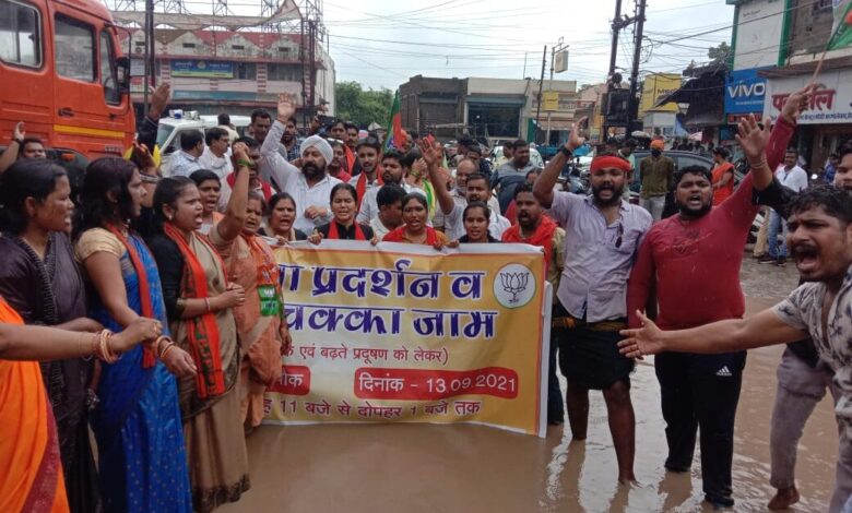 रायगढ़ की बदहाल सड़कों को लेकर भाजपा का प्रदर्शन, भरी बरसात में भीगते हुए घंटो तक सड़क जाम आंदोलन